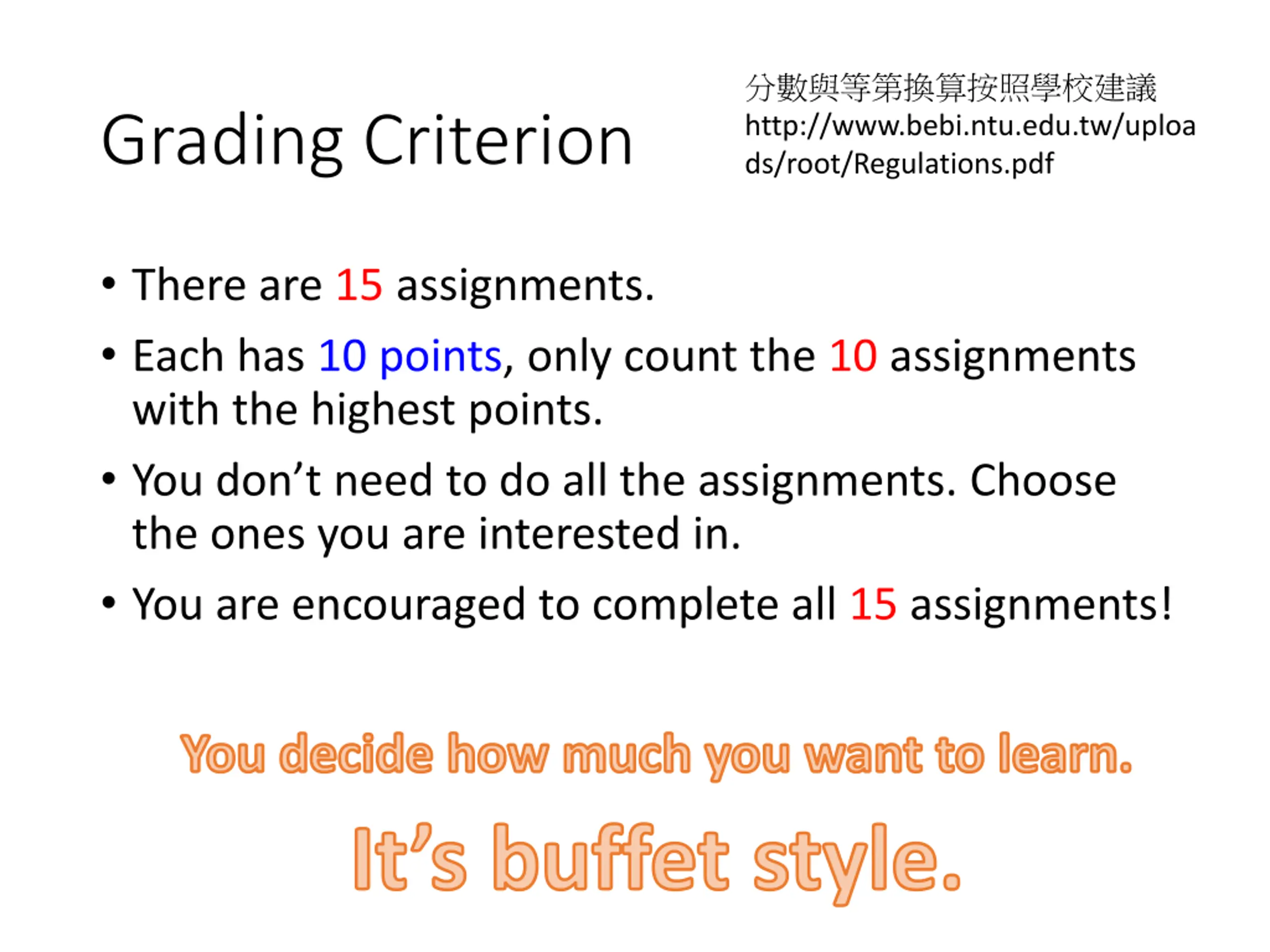http://www.bebi.ntu.edu.tw/uploa ds/root/Regulations.pdf Grading Criterion There are 15 assignments. Each has 10 points, only count the 10 assignments with the highest points. You don t need to do all the assignments. Choose the ones you are interested in. You are encouraged to complete all 15 assignments! You decide how much you want to learn. It s buffet style.
