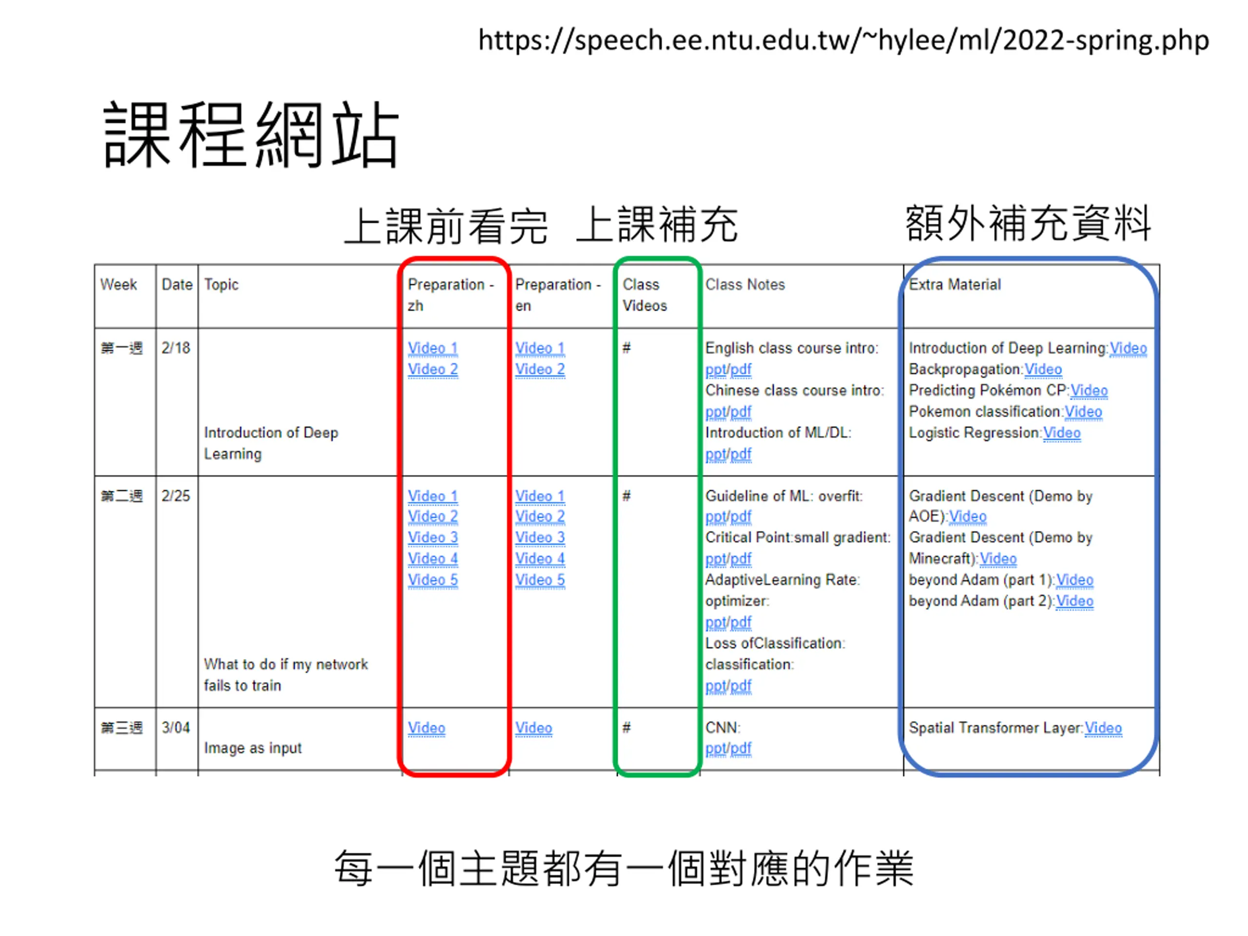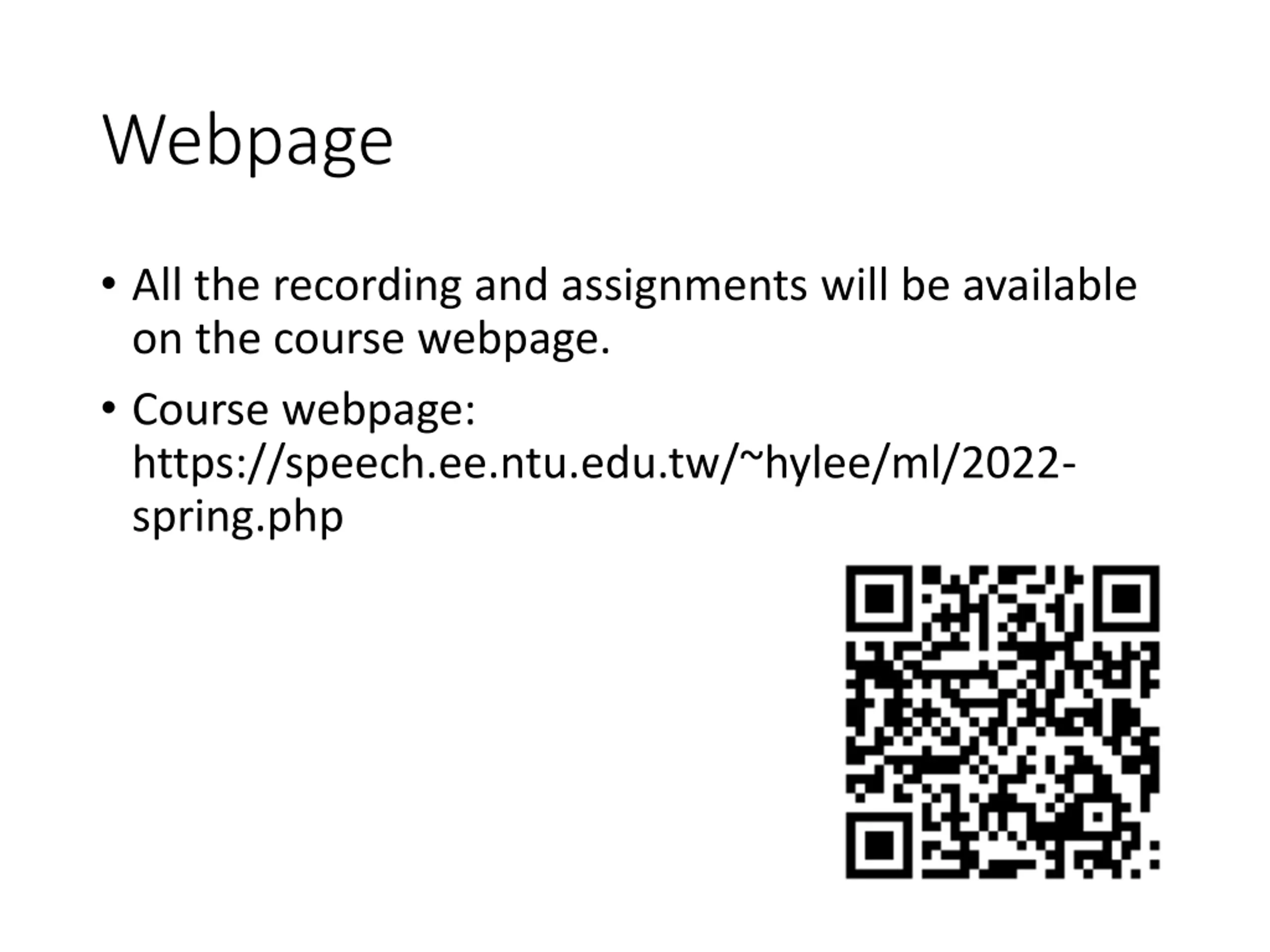 Webpage All the recording and assignments will be available on the course webpage. Course webpage: https://speech.ee.ntu.edu.tw/~hylee/ml/2022- spring.php