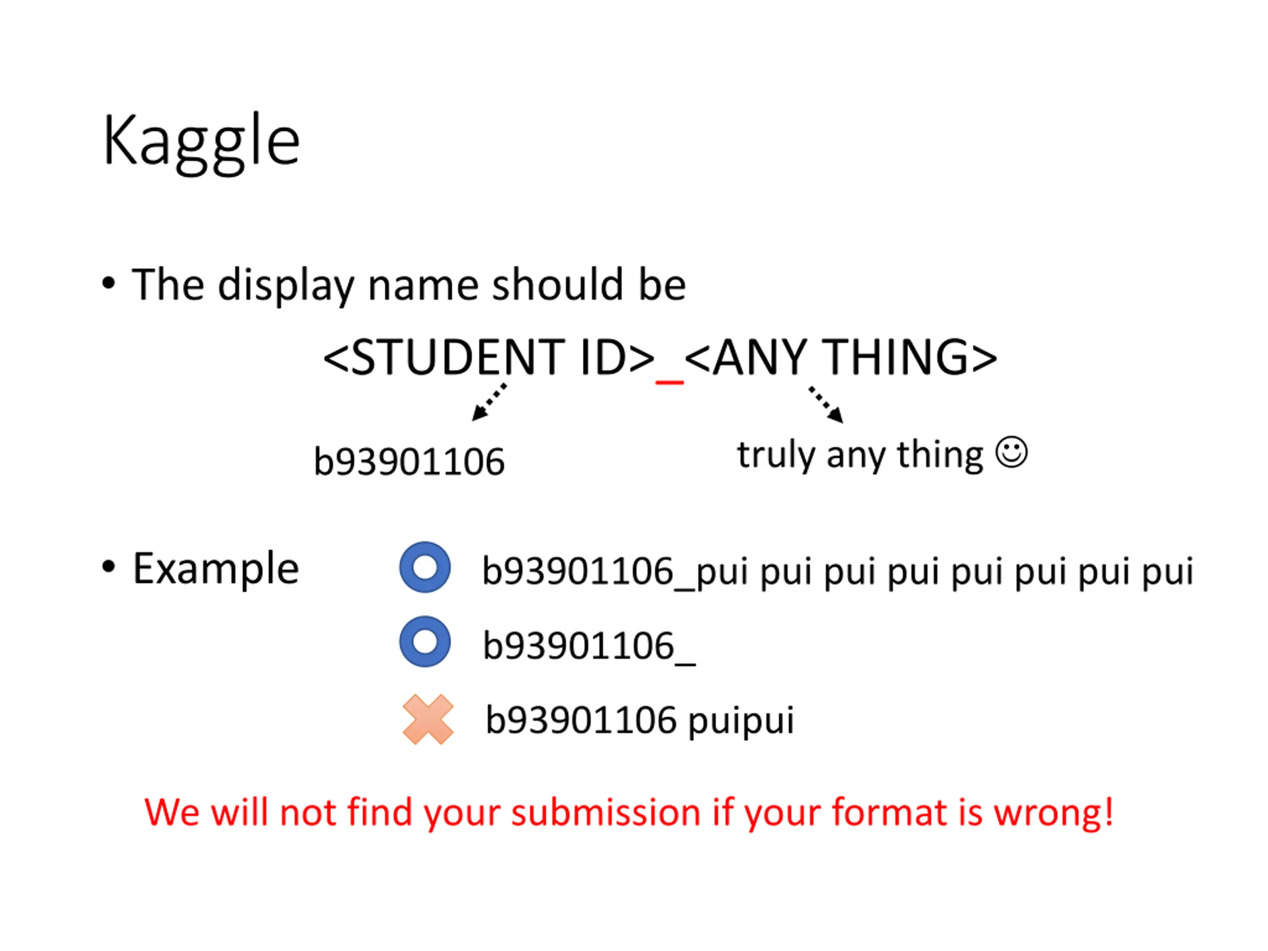 Kaggle The display name should be <STUDENT ID>_<ANY THING> truly any thing b93901106 Example b93901106_pui pui pui pui pui pui pui pui b93901106_ b93901106 puipui We will not find your submission if your format is wrong!