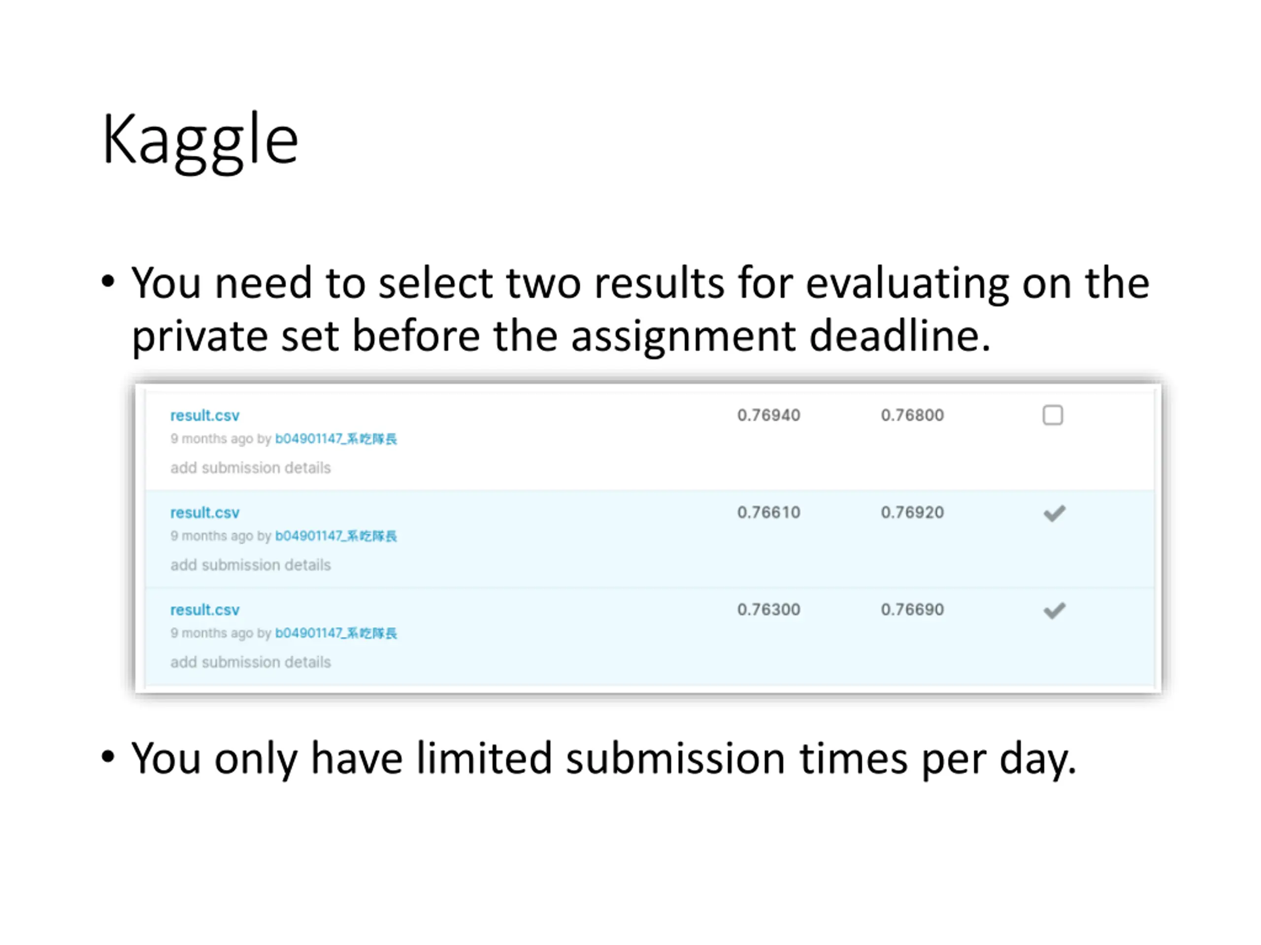 Kaggle You need to select two results for evaluating on the private set before the assignment deadline. You only have limited submission times per day.