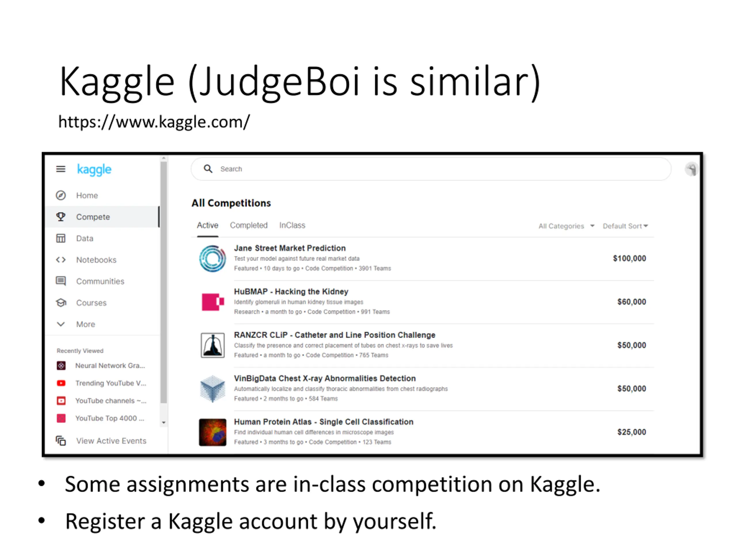 Kaggle (JudgeBoi is similar) https://www.kaggle.com/ Some assignments are in-class competition on Kaggle. Register a Kaggle account by yourself.