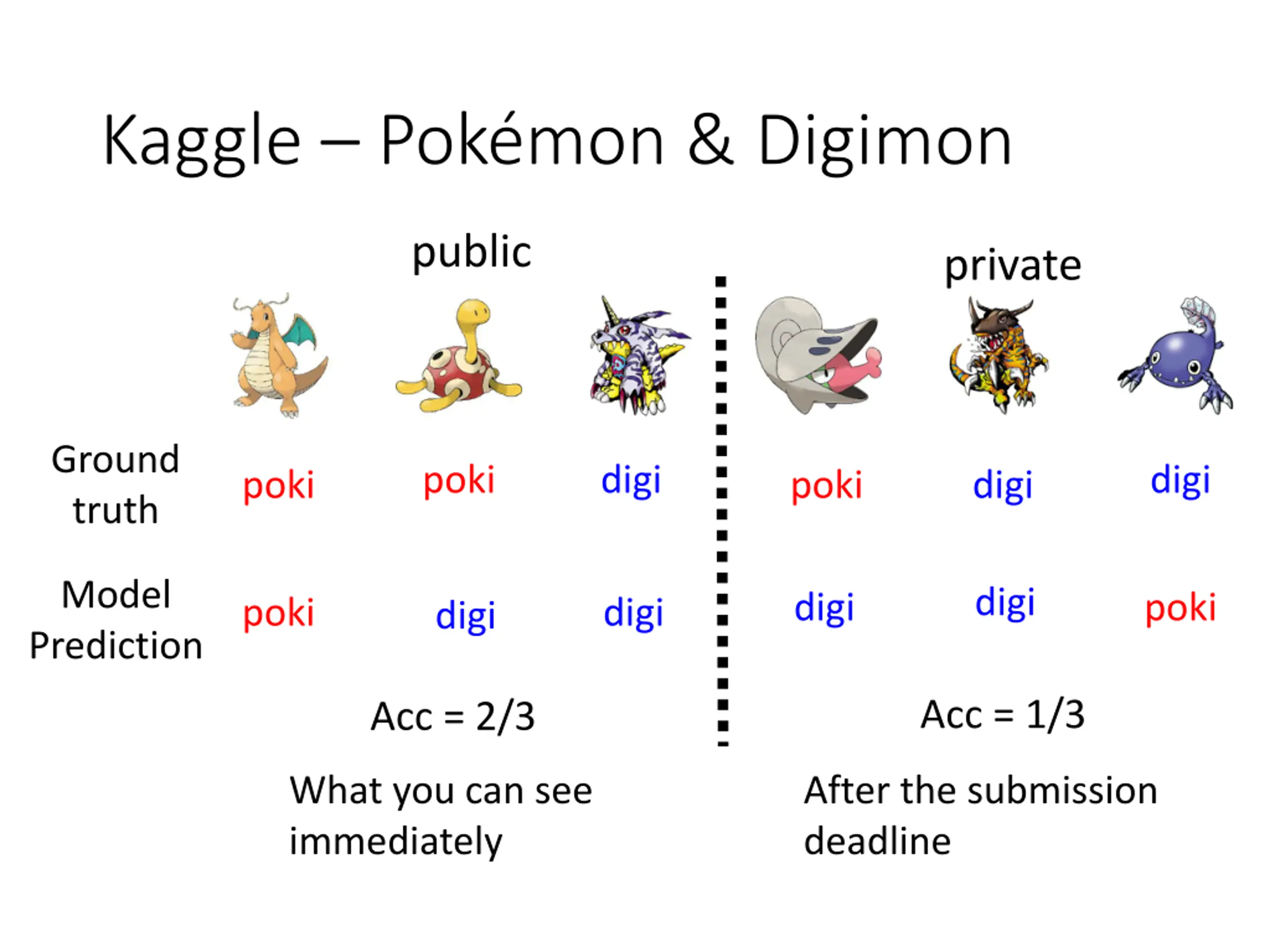 Kaggle Pokmon & Digimon public private Ground truth poki digi digi poki poki digi Model Prediction digi digi poki poki digi digi Acc = 1/3 Acc = 2/3 What you can see immediately After the submission deadline