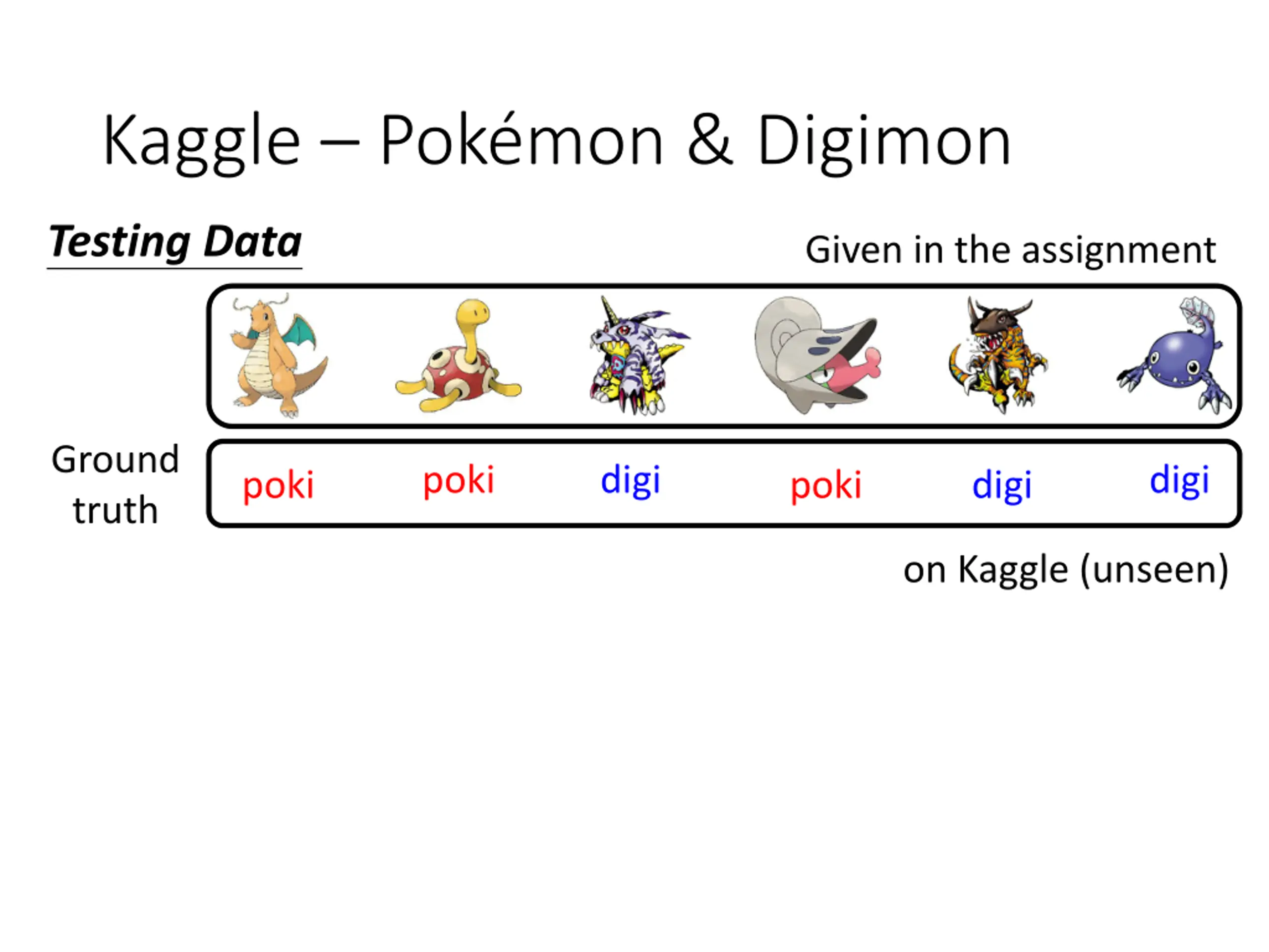 Kaggle Pokmon & Digimon Testing Data Given in the assignment Ground truth poki digi digi poki poki digi on Kaggle (unseen)