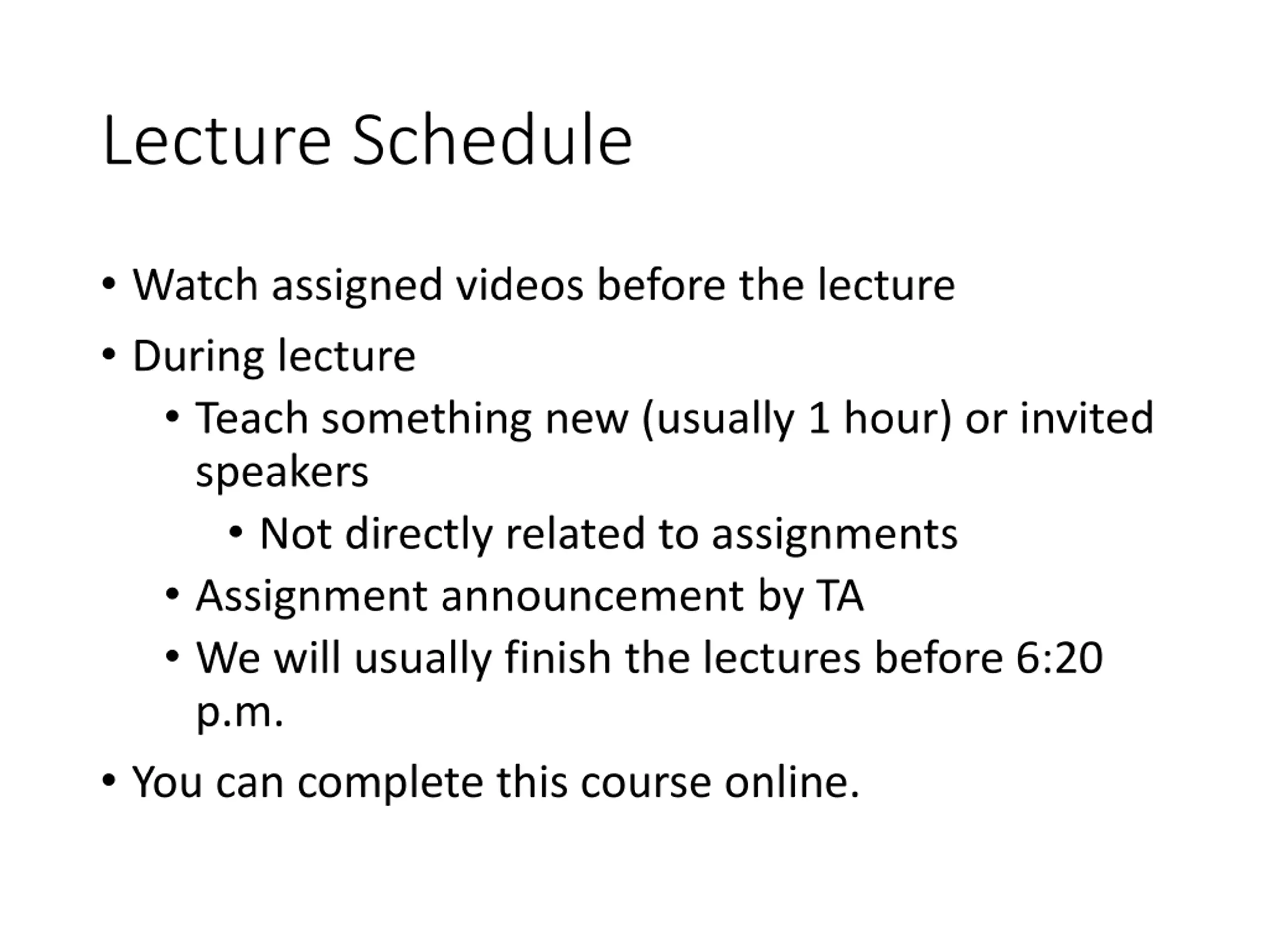 Lecture Schedule Watch assigned videos before the lecture During lecture Teach something new (usually 1 hour) or invited speakers Not directly related to assignments Assignment announcement by TA We will usually finish the lectures before 6:20 p.m. You can complete this course online.