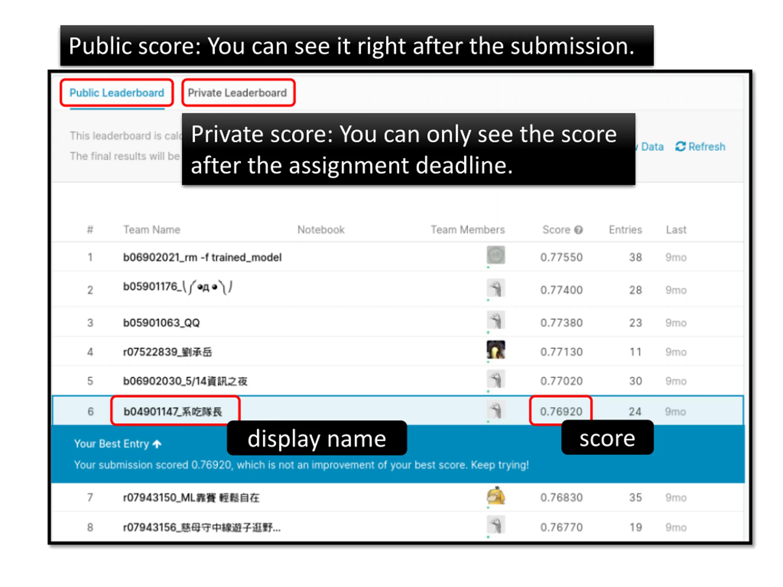 Public score: You can see it right after the submission. Private score: You can only see the score after the assignment deadline. score display name
