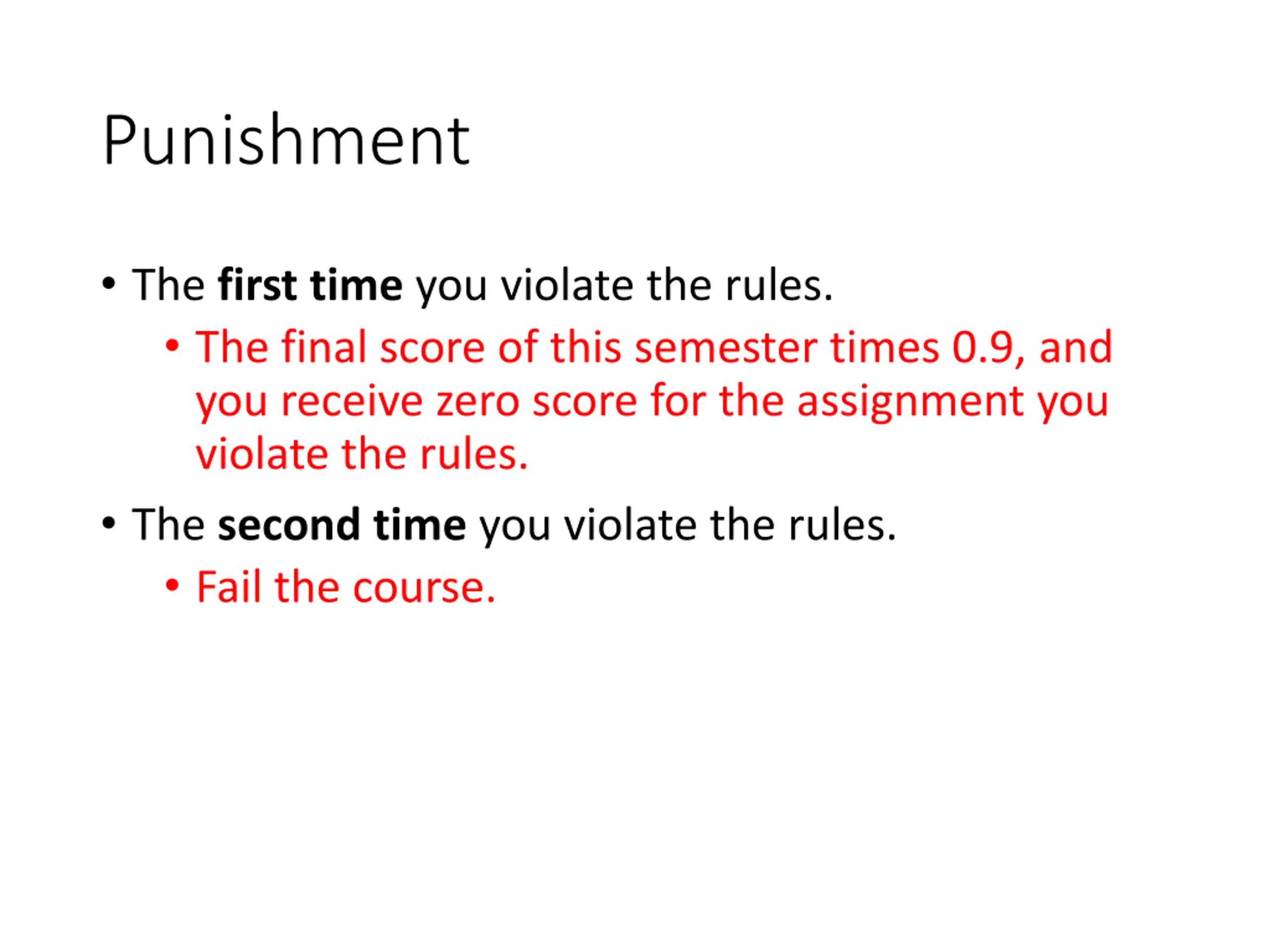 Punishment The first time you violate the rules. The final score of this semester times 0.9, and you receive zero score for the assignment you violate the rules. The second time you violate the rules. Fail the course.