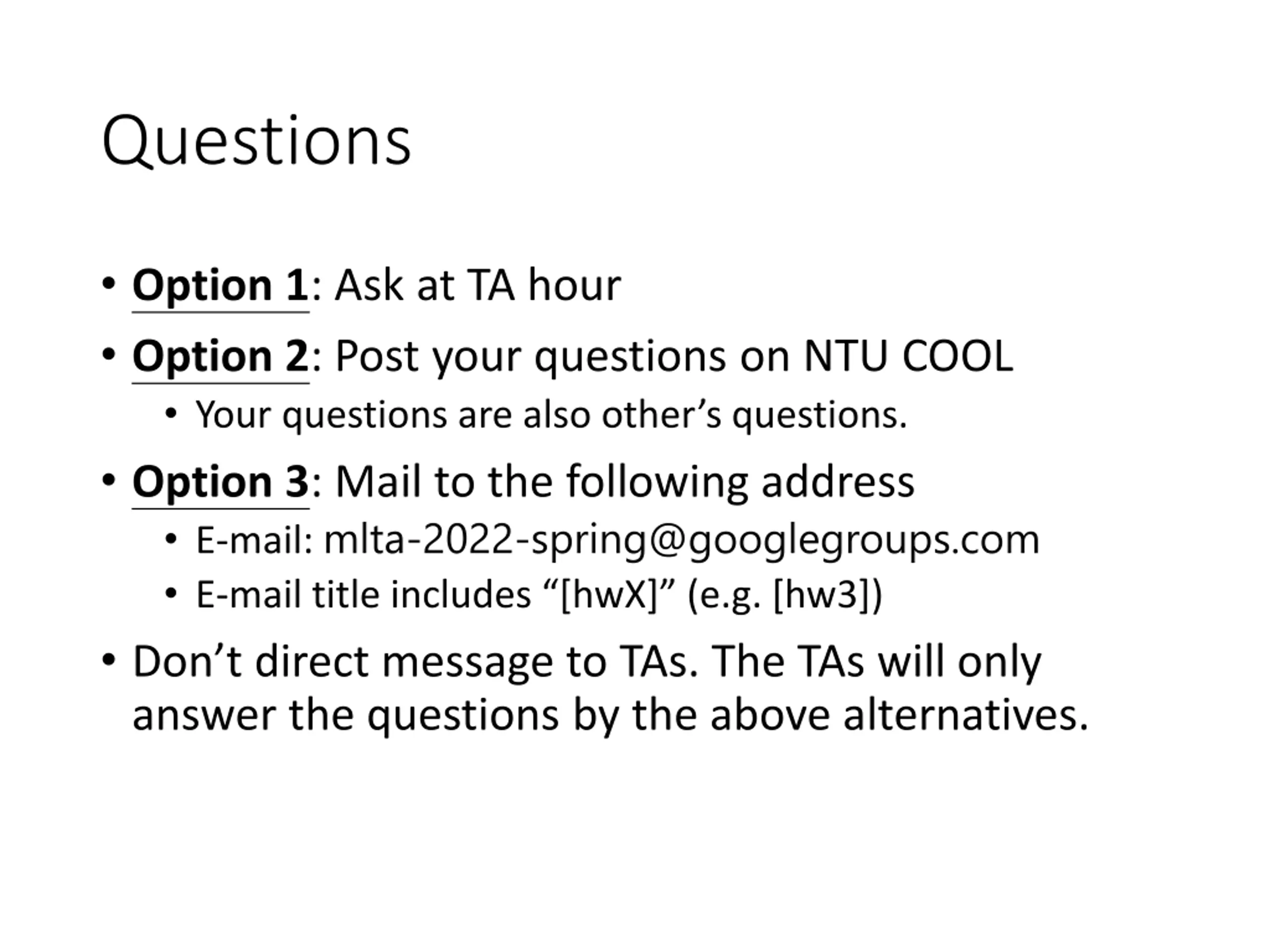 Questions Option 1: Ask at TA hour Option 2: Post your questions on NTU COOL Your questions are also other s questions. Option 3: Mail to the following address E-mail: mlta-2022-spring@googlegroups.com E-mail title includes [hwX] (e.g. [hw3]) Don t direct message to TAs. The TAs will only answer the questions by the above alternatives.