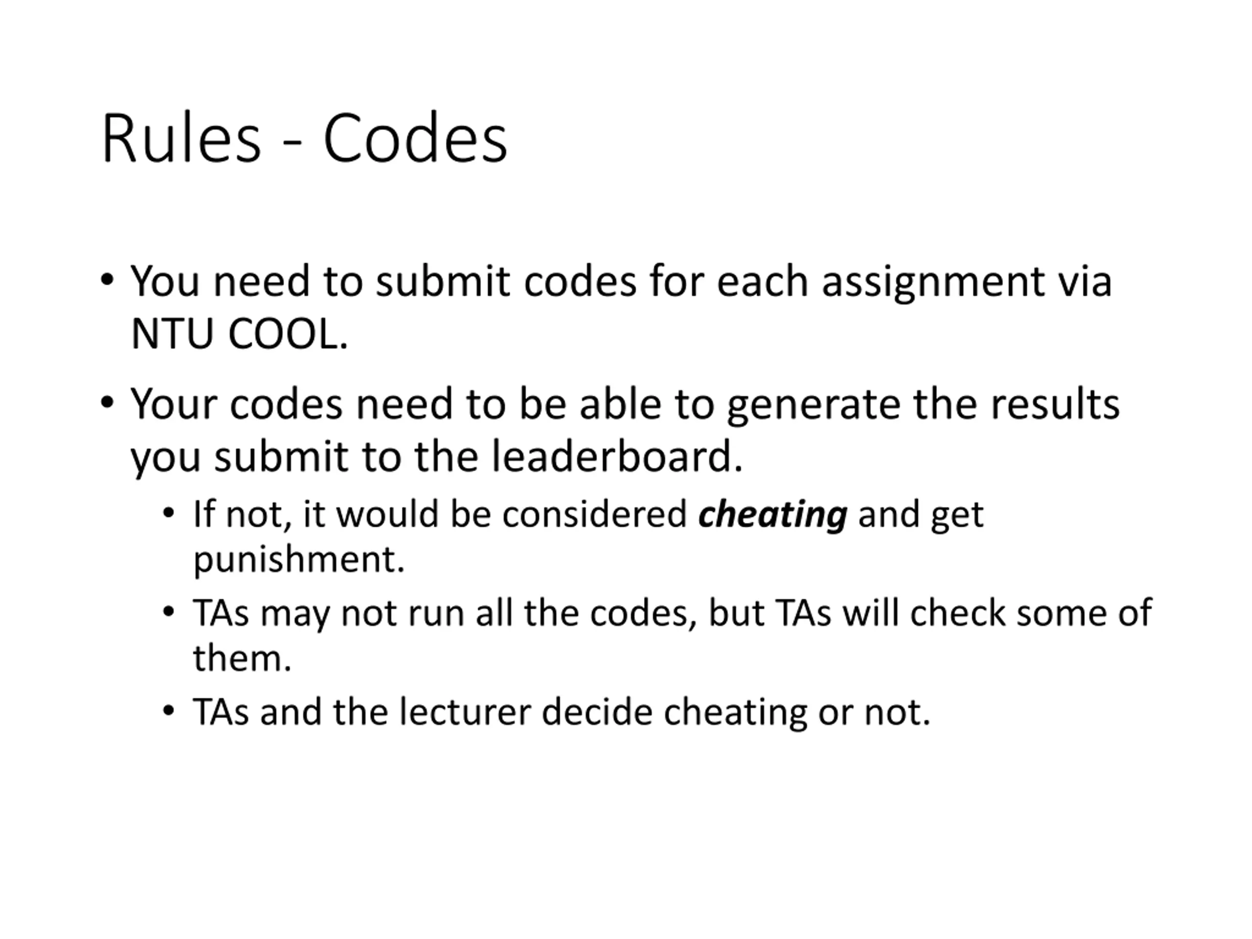 Rules - Codes You need to submit codes for each assignment via NTU COOL. Your codes need to be able to generate the results you submit to the leaderboard. If not, it would be considered cheating and get punishment. TAs may not run all the codes, but TAs will check some of them. TAs and the lecturer decide cheating or not.