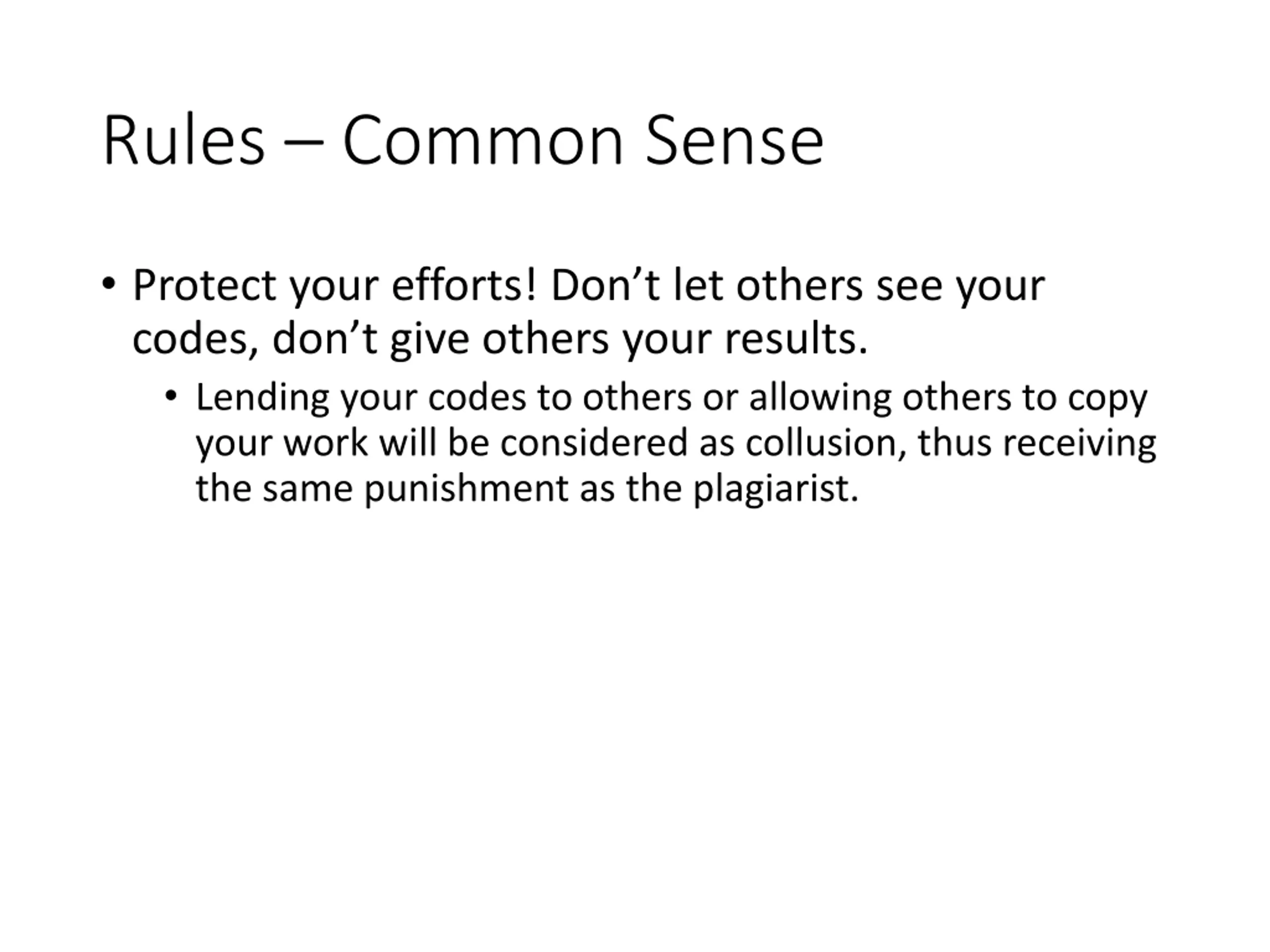 Rules Common Sense Protect your efforts! Don t let others see your codes, don t give others your results. Lending your codes to others or allowing others to copy your work will be considered as collusion, thus receiving the same punishment as the plagiarist.