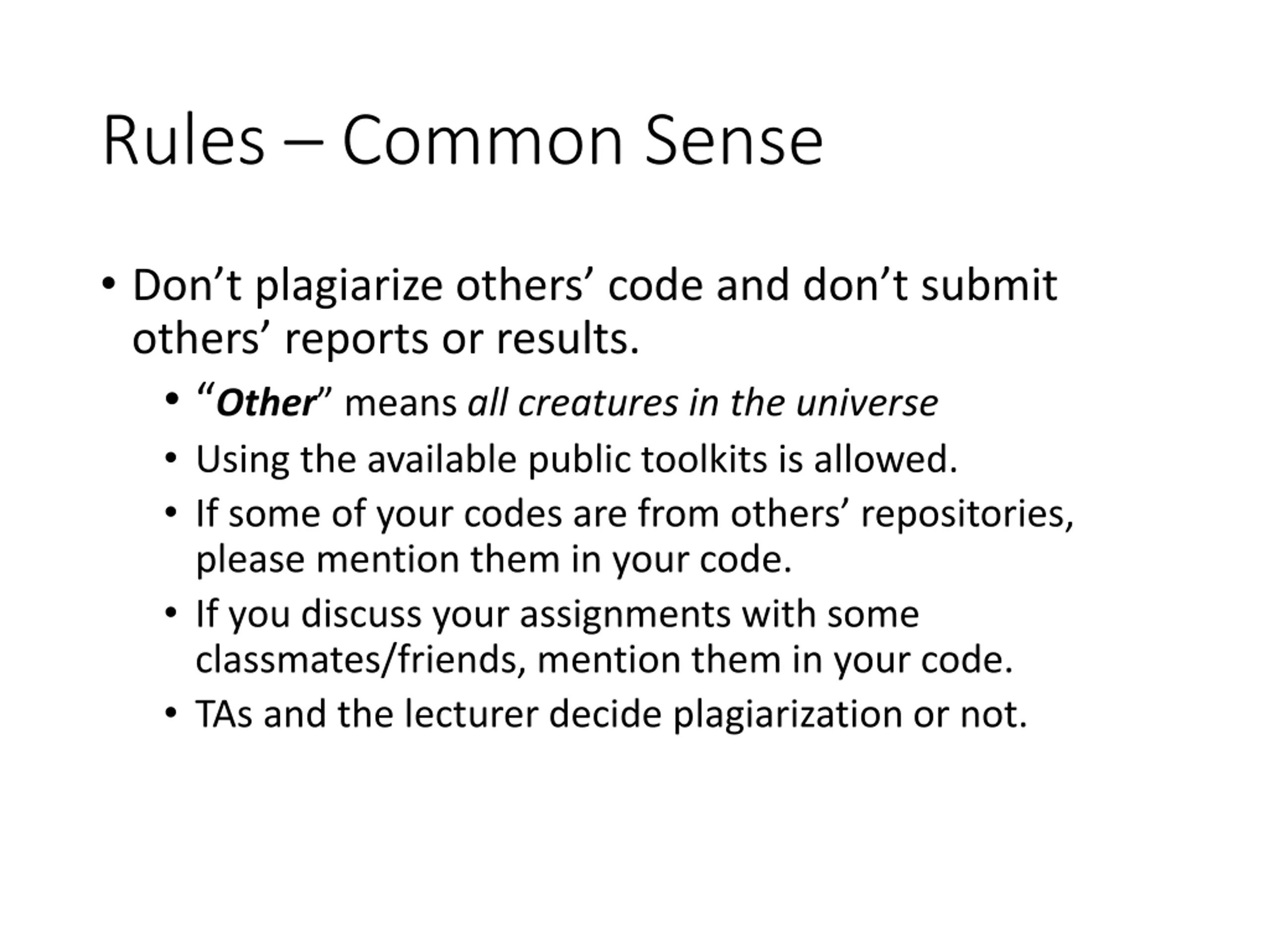 Rules Common Sense Don t plagiarize others code and don t submit others reports or results. Other means all creatures in the universe Using the available public toolkits is allowed. If some of your codes are from others repositories, please mention them in your code. If you discuss your assignments with some classmates/friends, mention them in your code. TAs and the lecturer decide plagiarization or not.