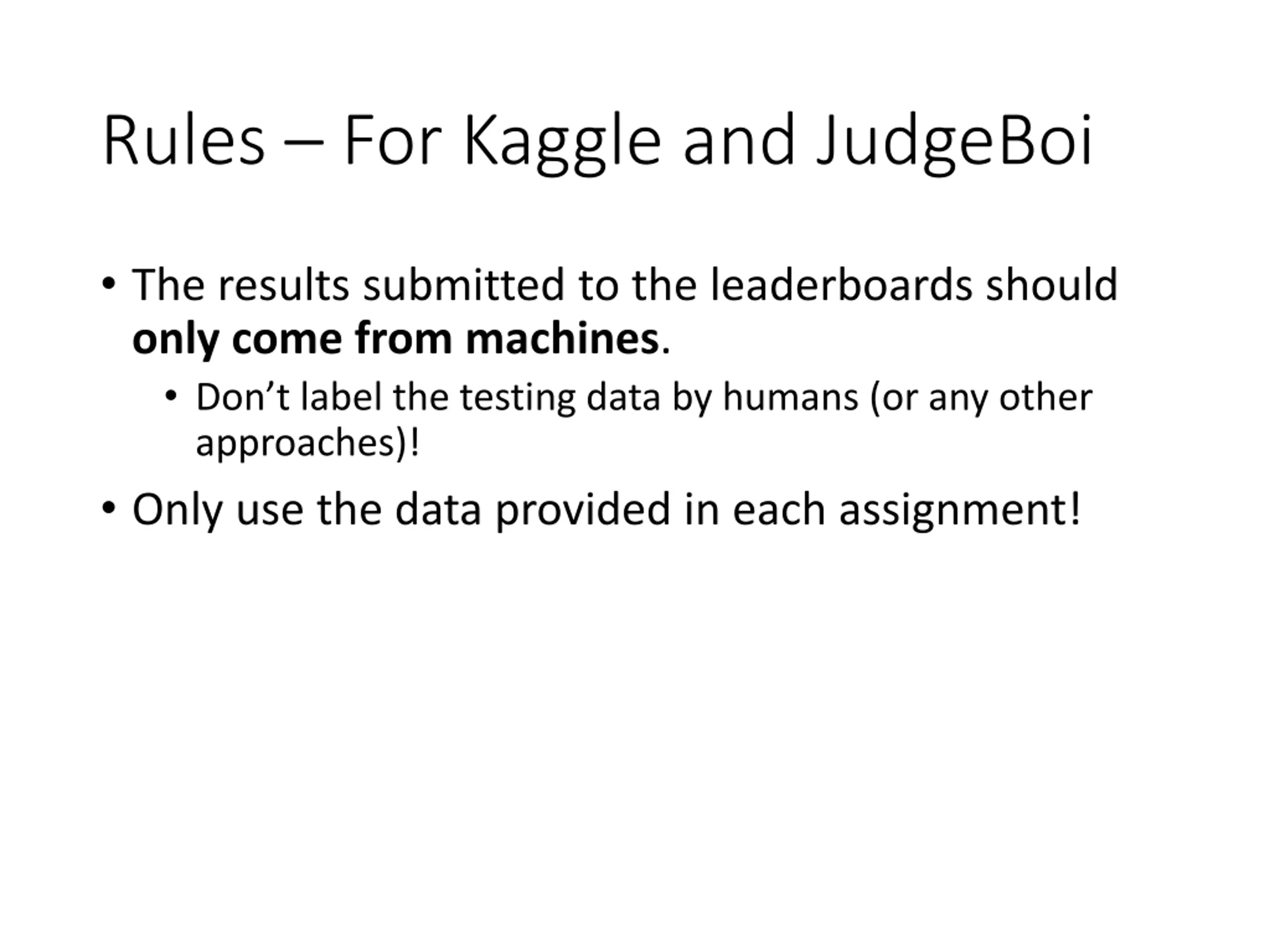 Rules For Kaggle and JudgeBoi The results submitted to the leaderboards should only come from machines. Don t label the testing data by humans (or any other approaches)! Only use the data provided in each assignment!