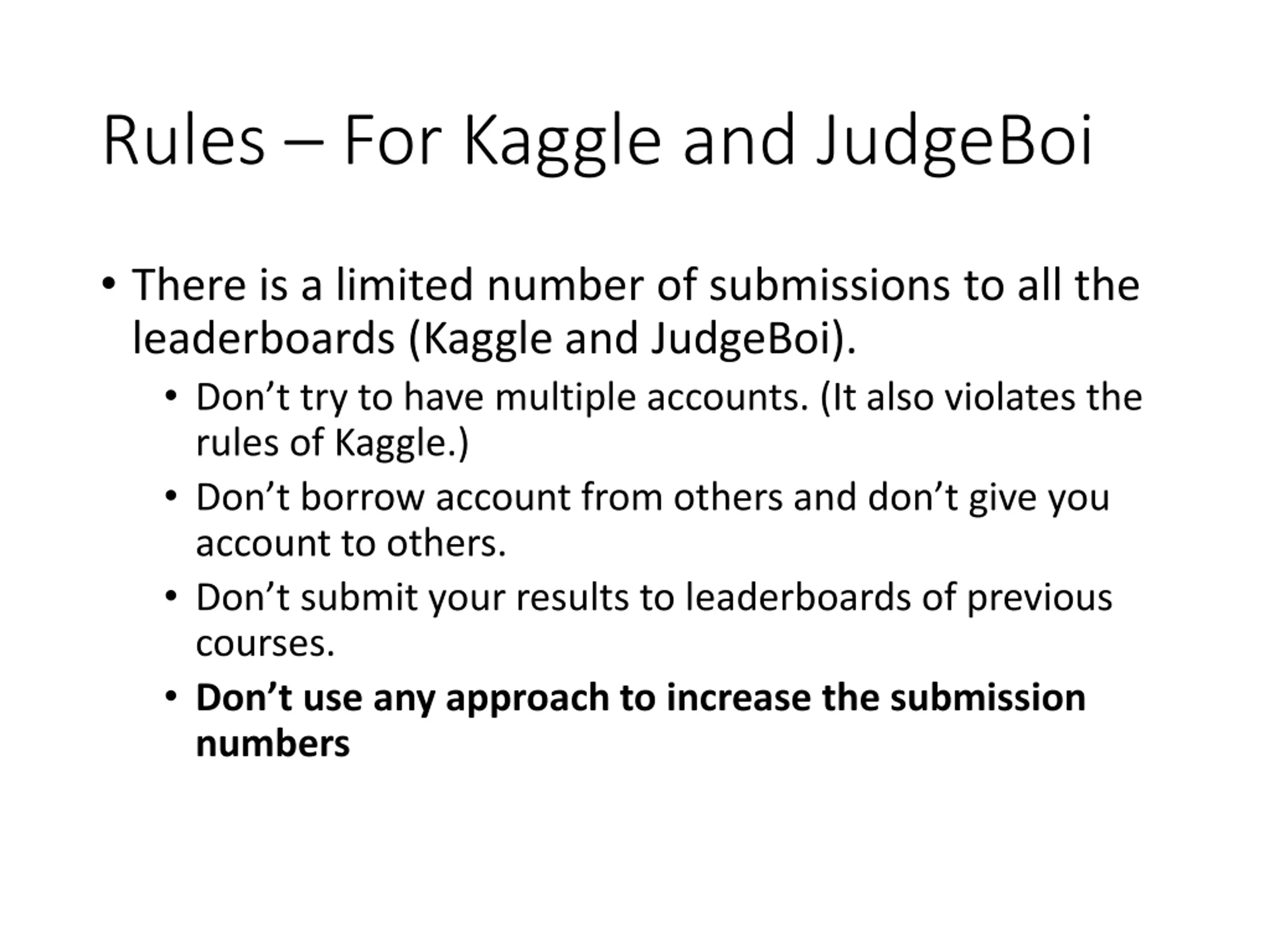 Rules For Kaggle and JudgeBoi There is a limited number of submissions to all the leaderboards (Kaggle and JudgeBoi). Don t try to have multiple accounts. (It also violates the rules of Kaggle.) Don t borrow account from others and don t give you account to others. Don t submit your results to leaderboards of previous courses. Don t use any approach to increase the submission numbers