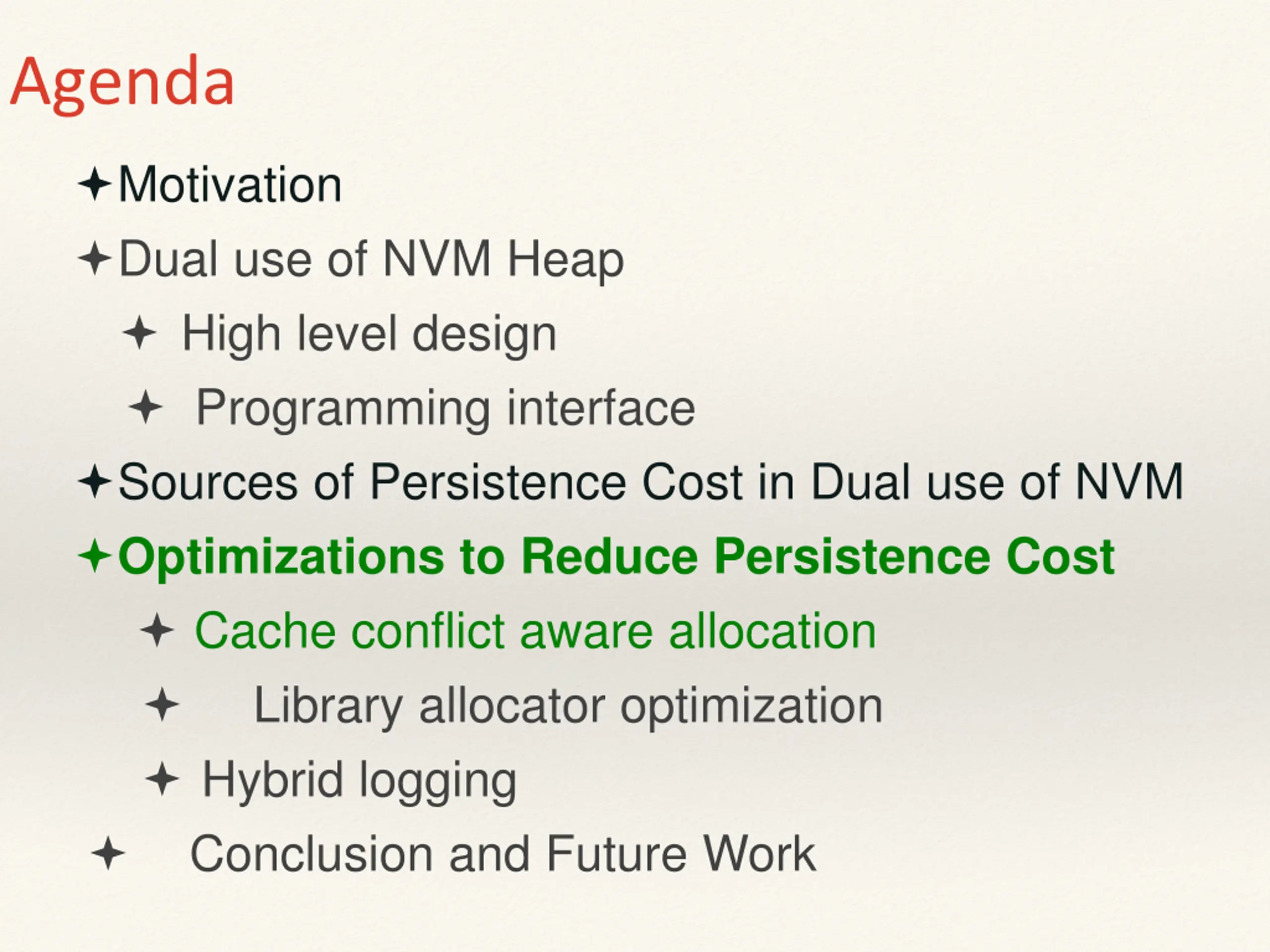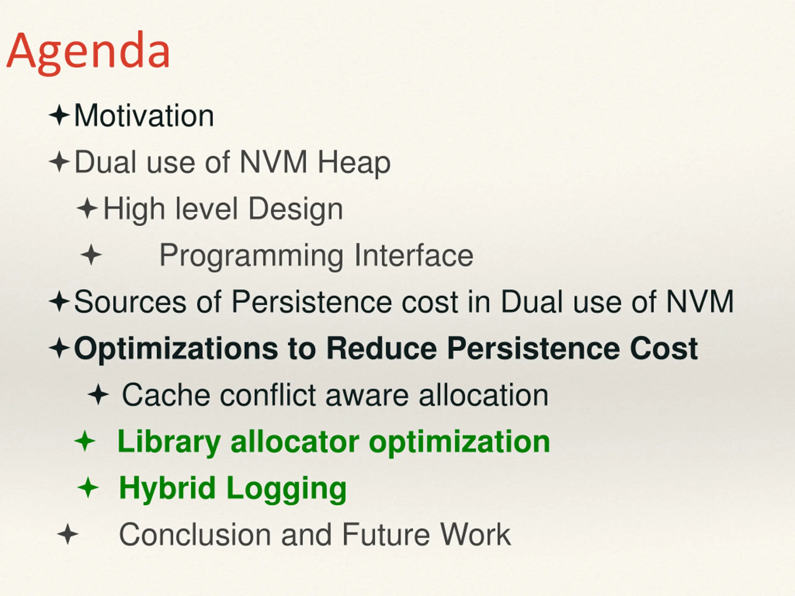 Agenda Motivation Dual use of NVM Heap High level design Programming interface Sources of Persistence Cost in Dual use of NVM Optimizations to Reduce Persistence Cost Cache conflict aware allocation Library allocator optimization Hybrid logging Conclusion and Future Work