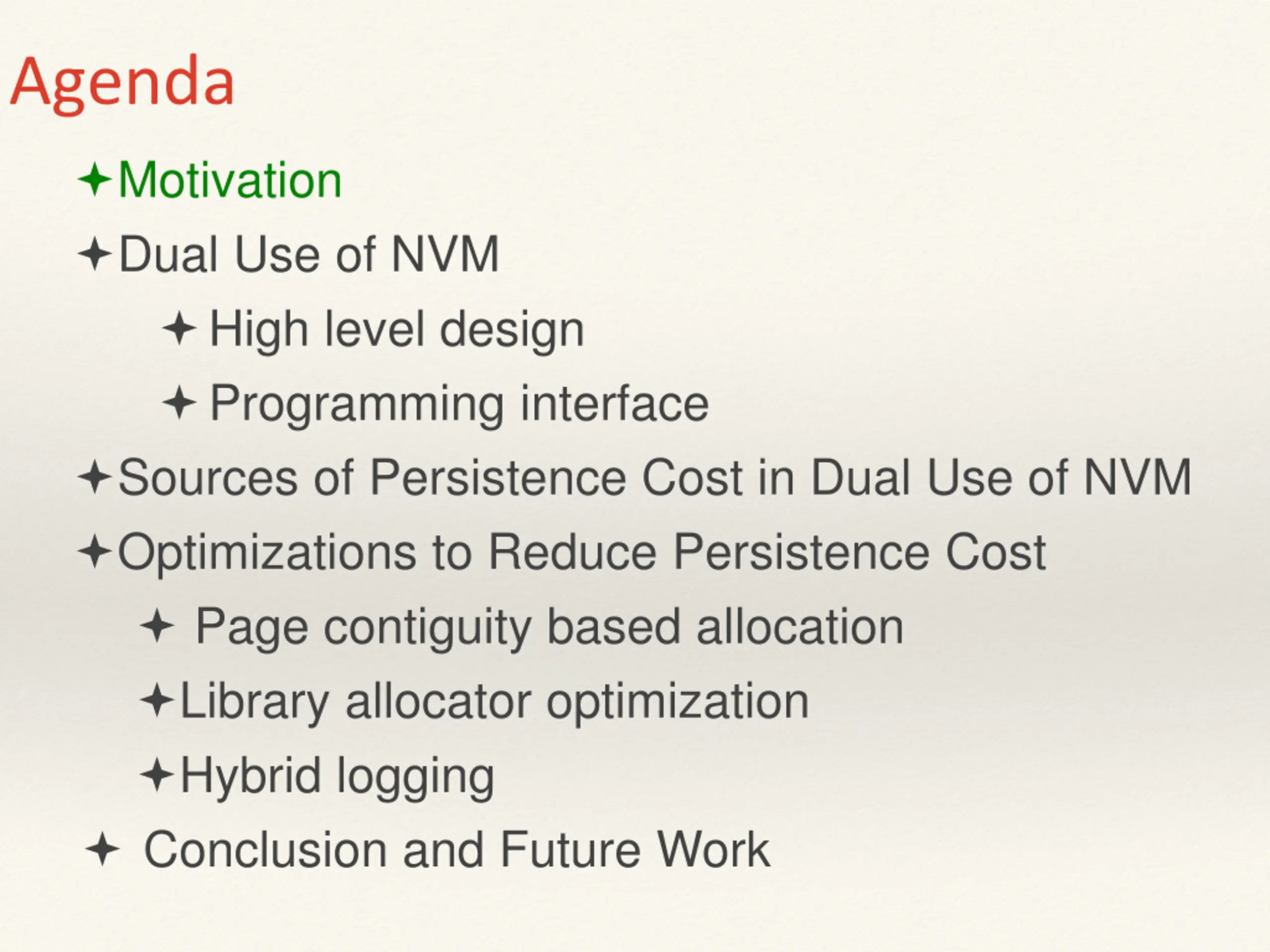 Agenda Motivation Dual Use of NVM High level design Programming interface Sources of Persistence Cost in Dual Use of NVM Optimizations to Reduce Persistence Cost Page contiguity based allocation Library allocator optimization Hybrid logging Conclusion and Future Work