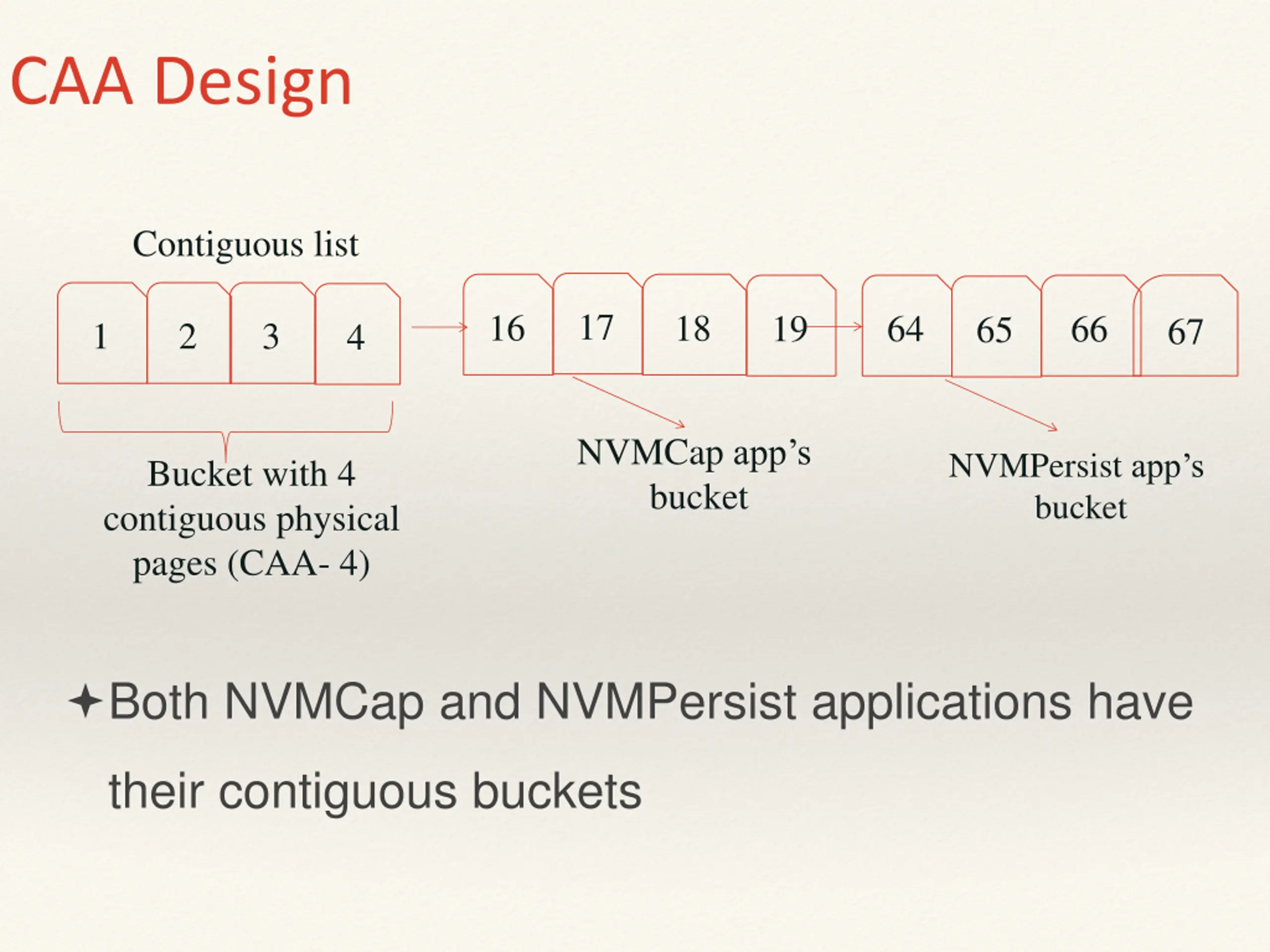 CAA Design Contiguous list 17 16 18 19 64 66 65 67 2 3 1 4 NVMCap app s bucket NVMPersist app s bucket Bucket with 4 contiguous physical pages (CAA- 4) Both NVMCap and NVMPersist applications have their contiguous buckets