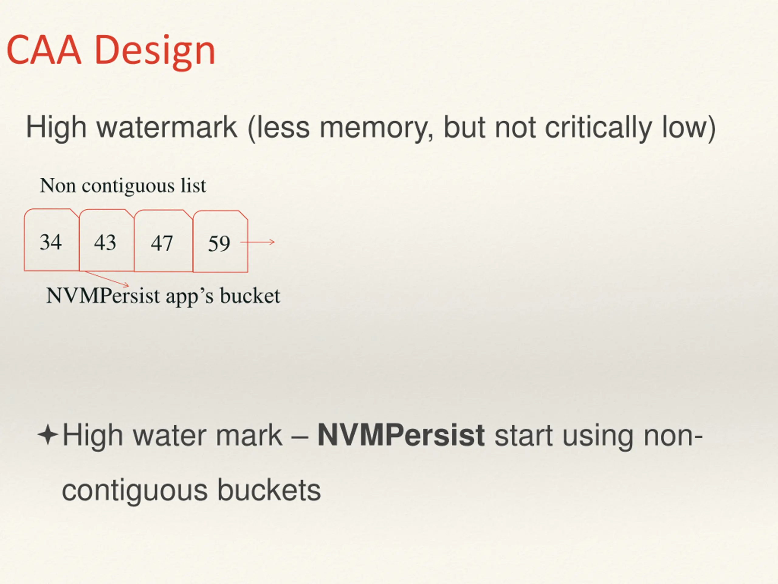 CAA Design High watermark (less memory, but not critically low) Non contiguous list 34 43 47 59 NVMPersist app s bucket High water mark NVMPersist start using non- contiguous buckets