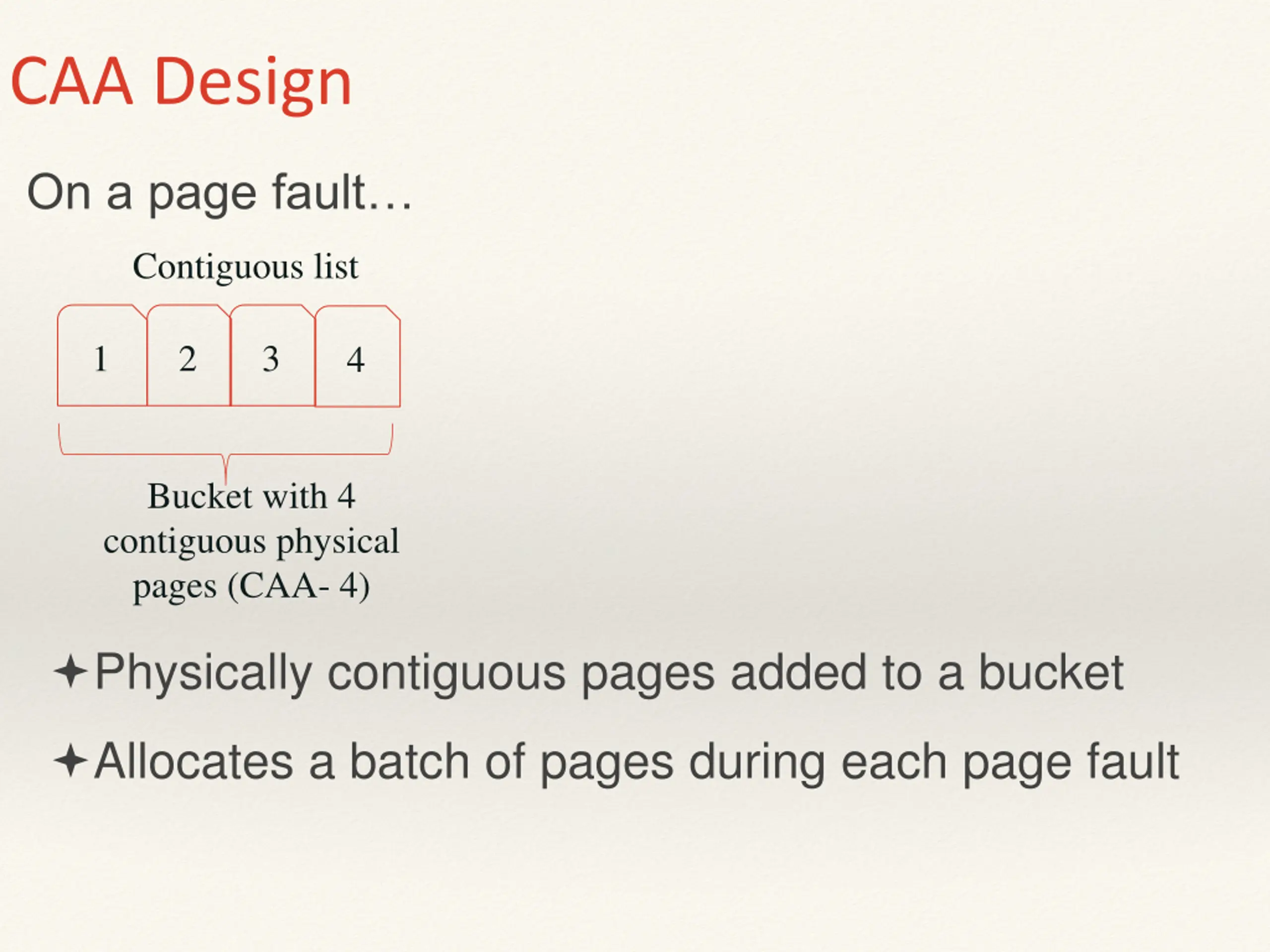 CAA Design On a page fault Contiguous list 2 3 1 4 Bucket with 4 contiguous physical pages (CAA- 4) Physically contiguous pages added to a bucket Allocates a batch of pages during each page fault
