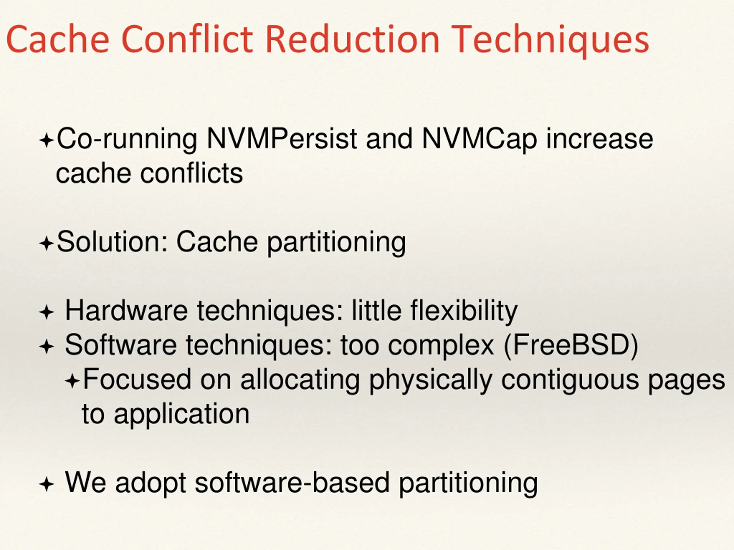 Cache Conflict Reduction Techniques Co-running NVMPersist and NVMCap increase cache conflicts Solution: Cache partitioning Hardware techniques: little flexibility Software techniques: too complex (FreeBSD) Focused on allocating physically contiguous pages to application We adopt software-based partitioning