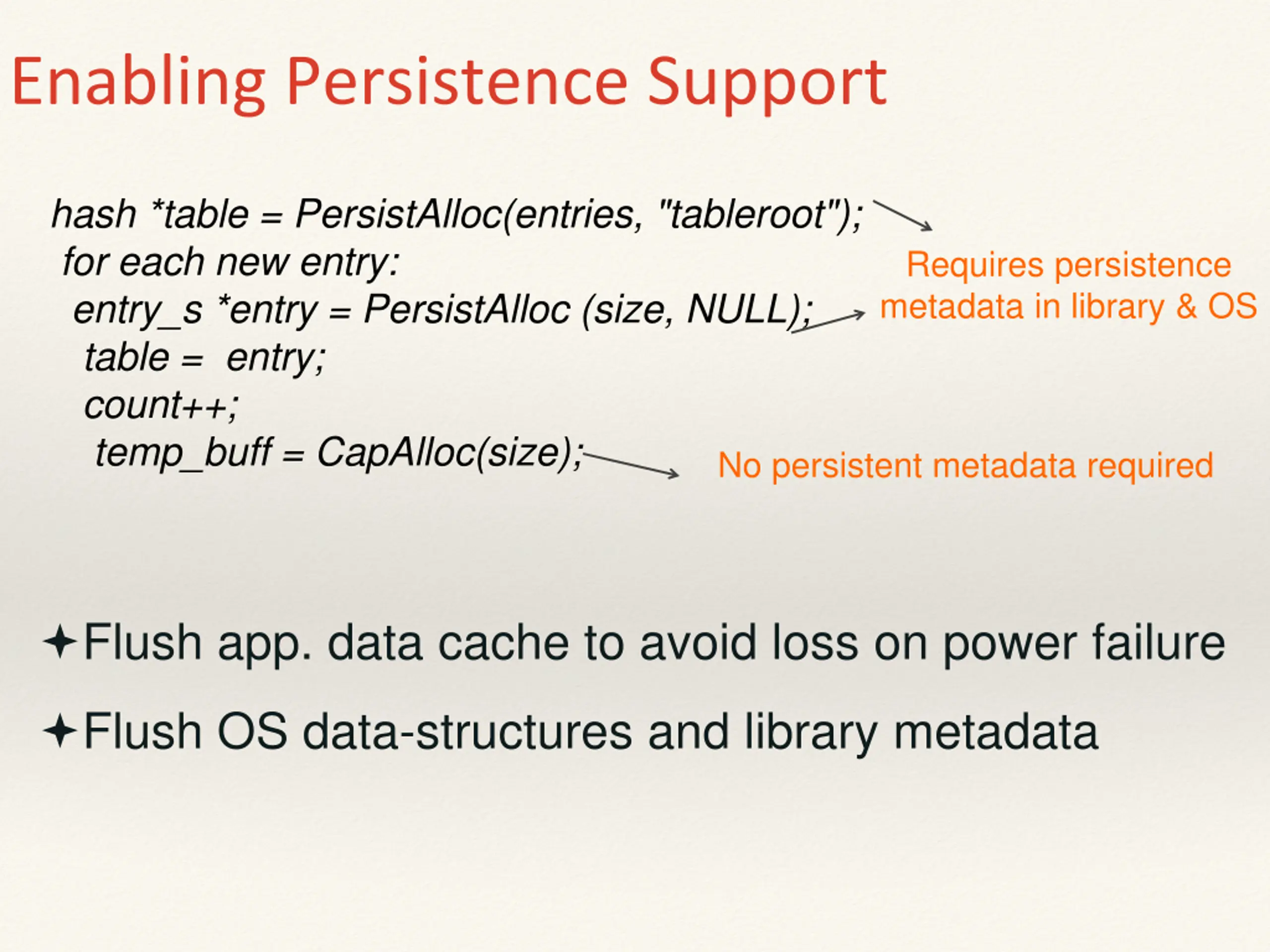 Enabling Persistence Support hash *table = PersistAlloc(entries, "tableroot"); for each new entry: entry_s *entry = PersistAlloc (size, NULL); table = entry; count++; temp_buff = CapAlloc(size); Requires persistence metadata in library & OS No persistent metadata required Flush app. data cache to avoid loss on power failure Flush OS data-structures and library metadata