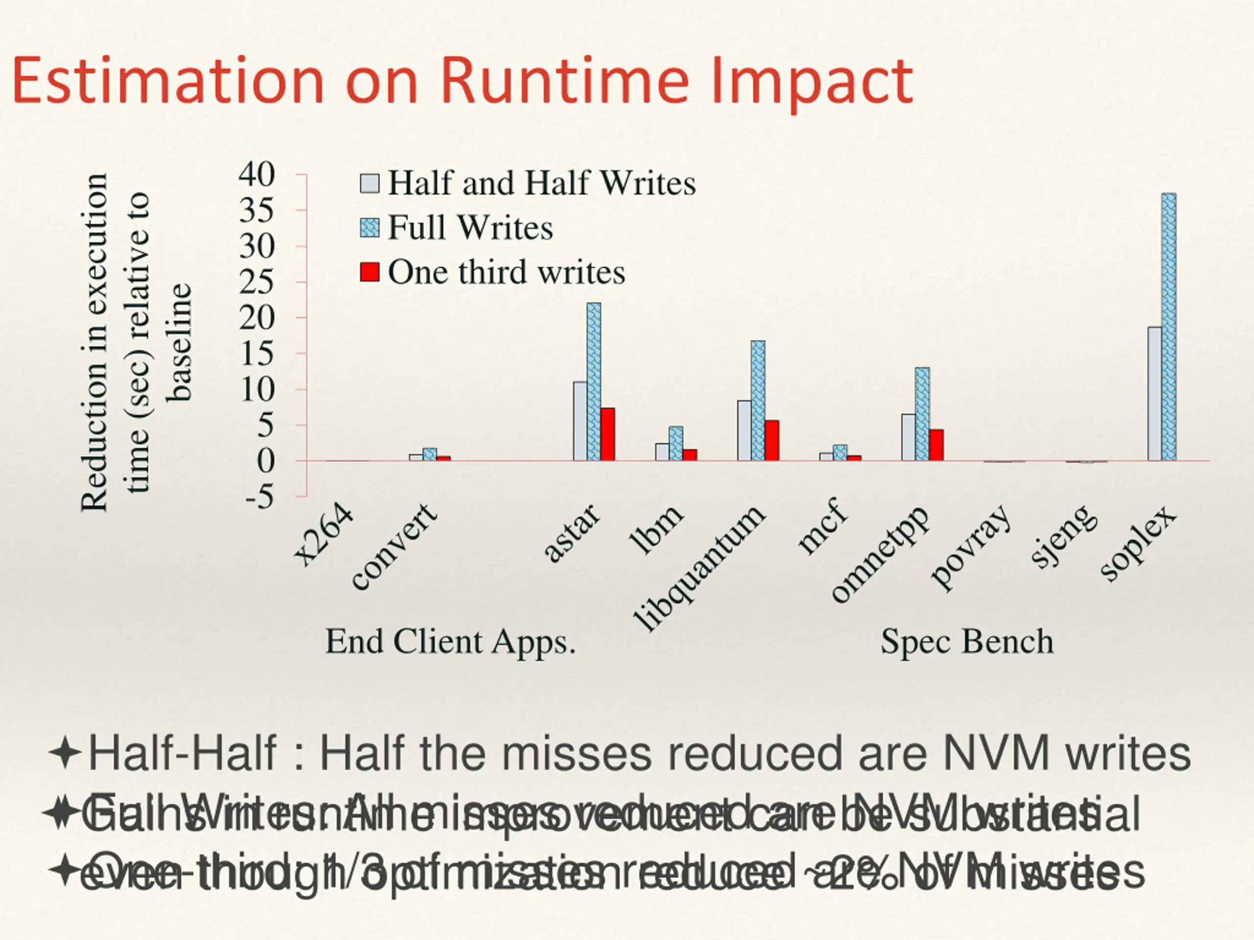 Estimation on Runtime Impact 40 Half and Half Writes Full Writes One third writes Reduction in execution time (sec) relative to 35 30 25 baseline 20 15 10 5 0 -5 End Client Apps. Spec Bench Half-Half : Half the misses reduced are NVM writes Full Writes: All misses reduced are NVM writes One-third: 1/3 of misses reduced are NVM writes even though optimization reduce ~2% of misses Gains in runtime improvement can be substantial