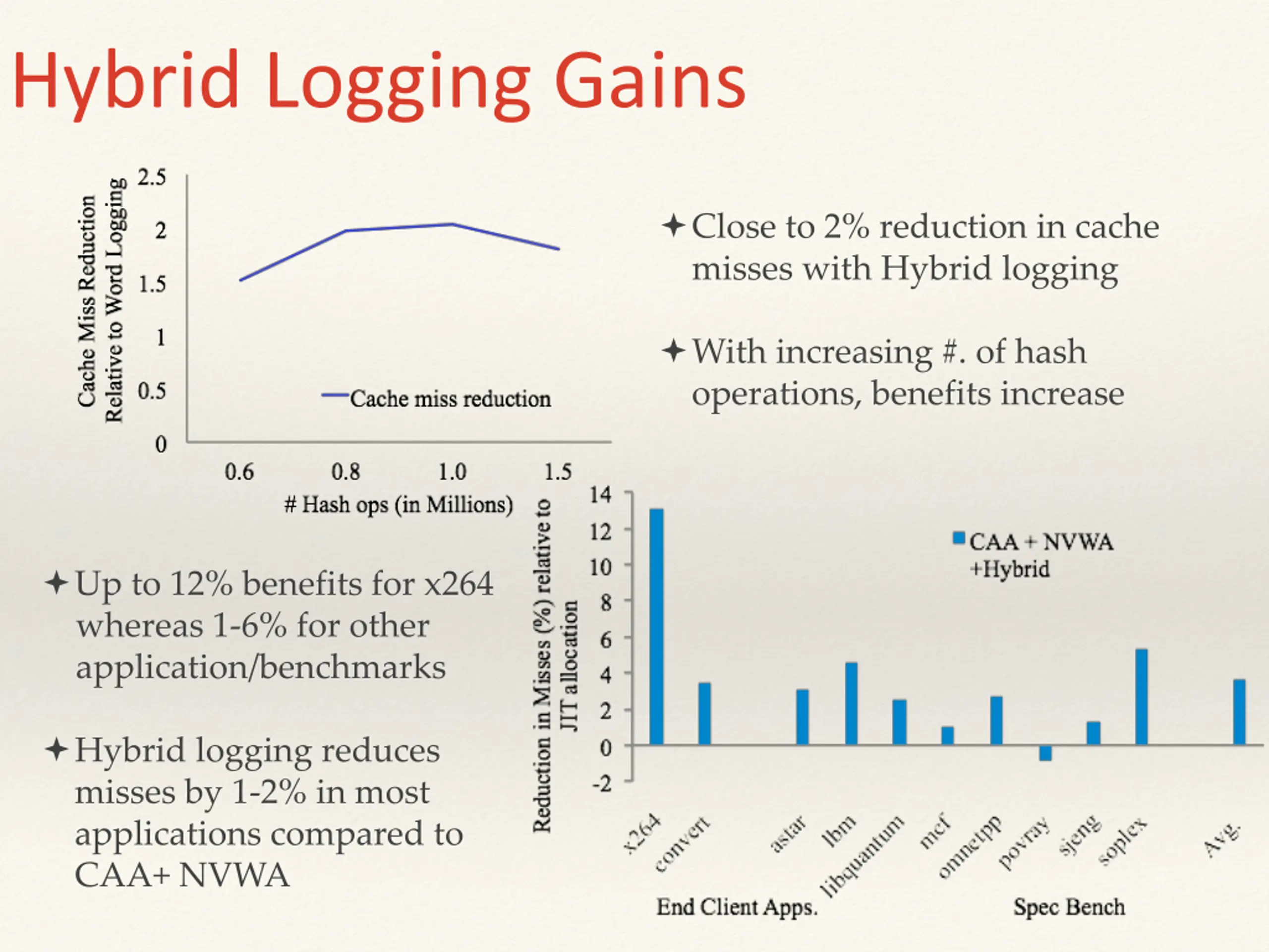 Hybrid Logging Gains Close to 2% reduction in cache misses with Hybrid logging With increasing #. of hash operations, benefits increase Up to 12% benefits for x264 whereas 1-6% for other application/benchmarks Hybrid logging reduces misses by 1-2% in most applications compared to CAA+ NVWA