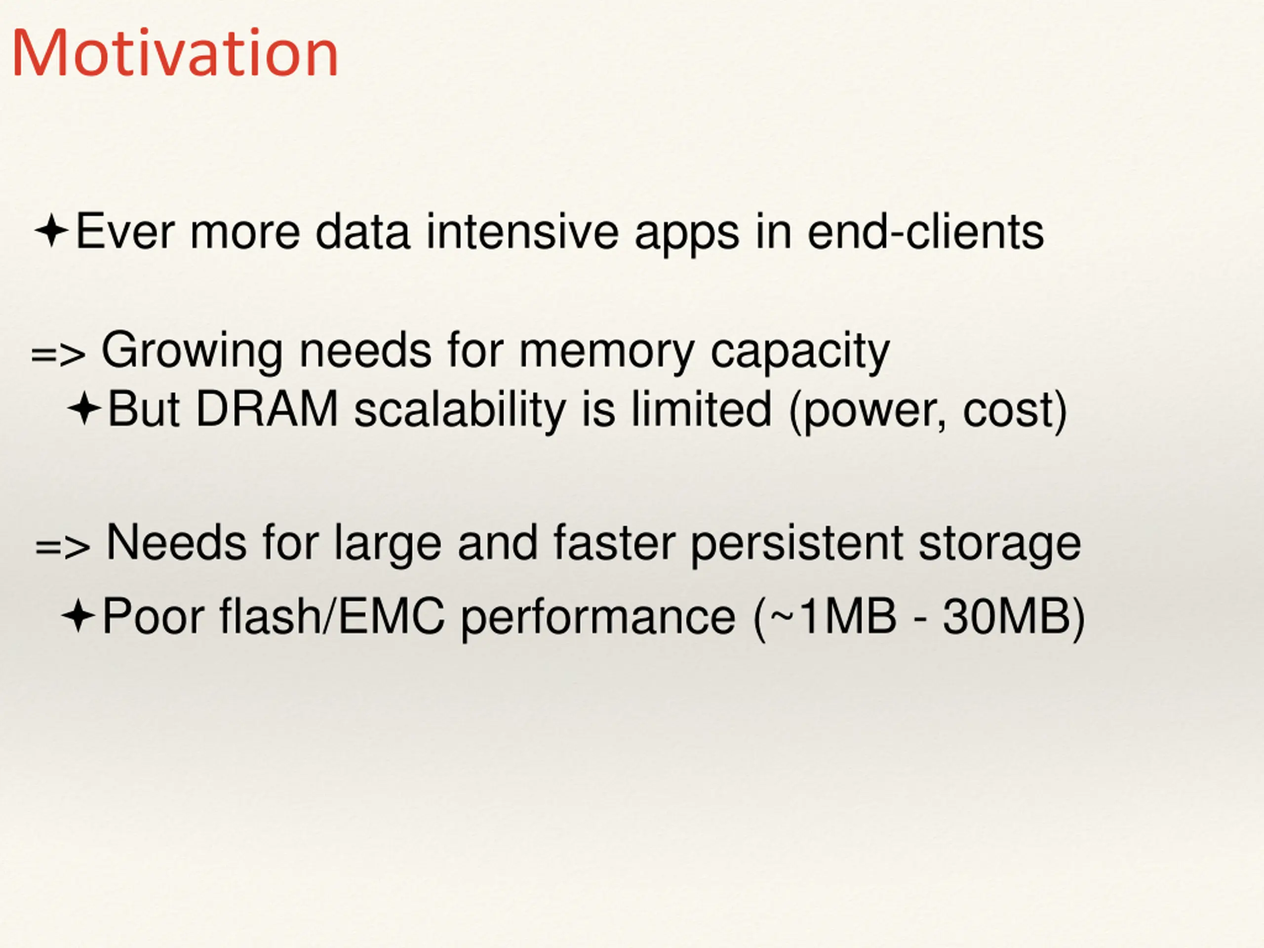 Motivation Ever more data intensive apps in end-clients => Growing needs for memory capacity But DRAM scalability is limited (power, cost) => Needs for large and faster persistent storage Poor flash/EMC performance (~1MB - 30MB)
