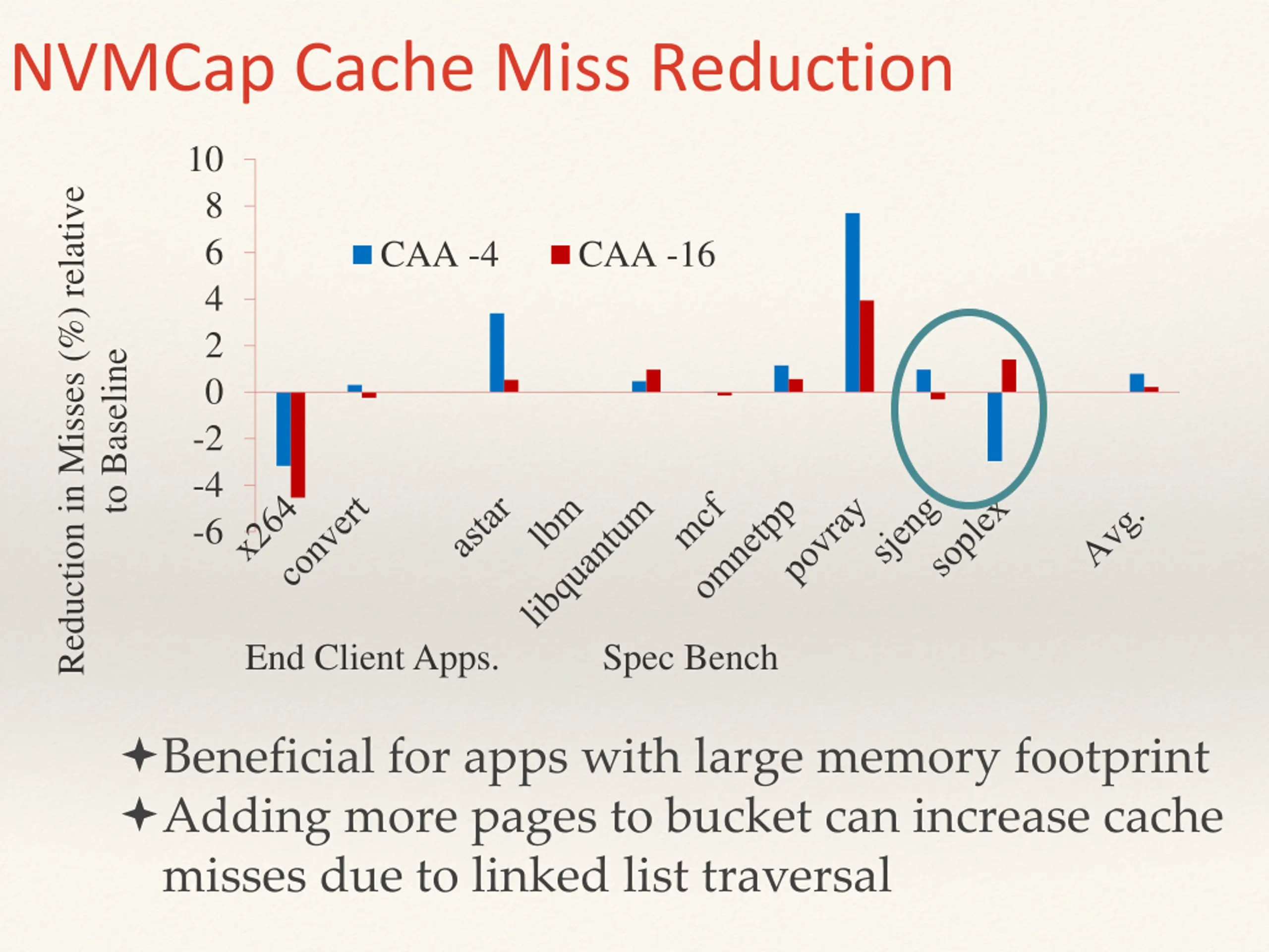 NVMCap Cache Miss Reduction 10 Reduction in Misses (%) relative 8 6 CAA -4 CAA -16 4 2 to Baseline 0 -2 -4 -6 End Client Apps. Spec Bench Beneficial for apps with large memory footprint Adding more pages to bucket can increase cache misses due to linked list traversal