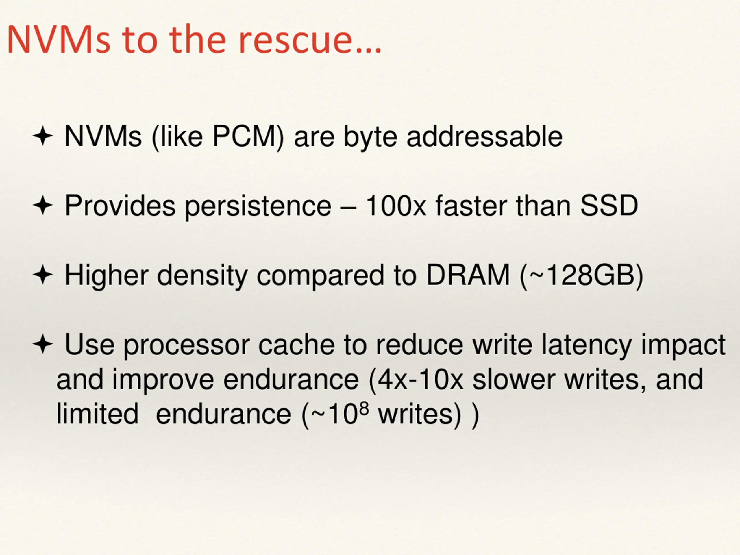 NVMs to the rescue NVMs (like PCM) are byte addressable Provides persistence 100x faster than SSD Higher density compared to DRAM (~128GB) Use processor cache to reduce write latency impact and improve endurance (4x-10x slower writes, and limited endurance (~108 writes) )