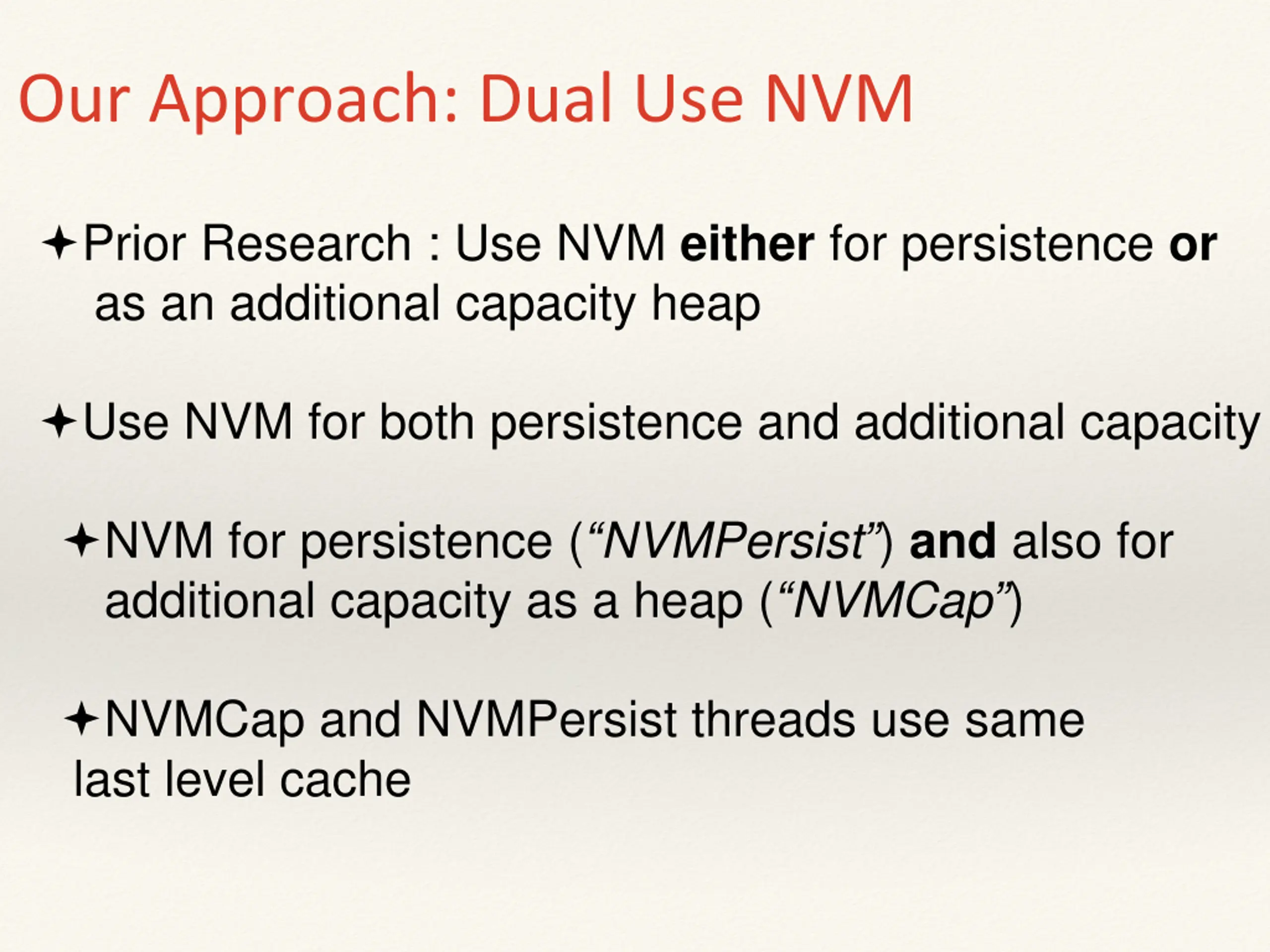 Our Approach: Dual Use NVM Prior Research : Use NVM either for persistence or as an additional capacity heap Use NVM for both persistence and additional capacity NVM for persistence ( NVMPersist ) and also for additional capacity as a heap ( NVMCap ) NVMCap and NVMPersist threads use same last level cache