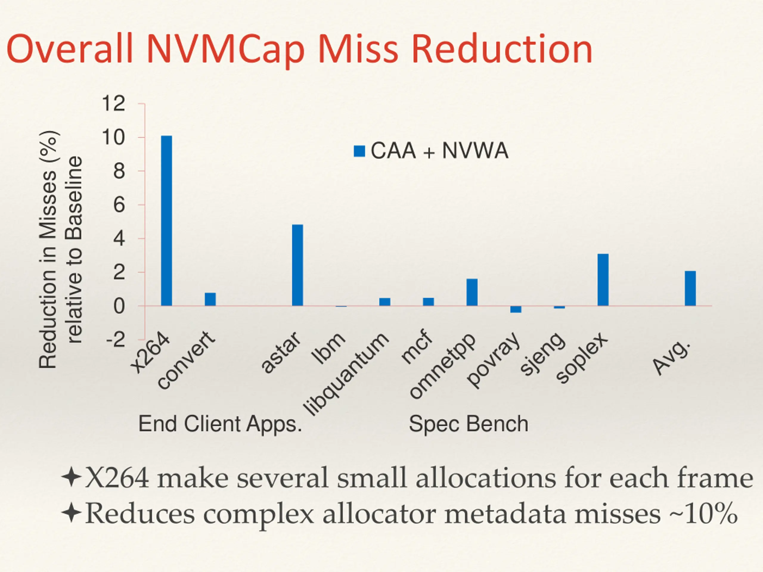 Overall NVMCap Miss Reduction 12 Reduction in Misses (%) 10 CAA + NVWA relative to Baseline 8 6 4 2 0 -2 End Client Apps. Spec Bench X264 make several small allocations for each frame Reduces complex allocator metadata misses ~10%
