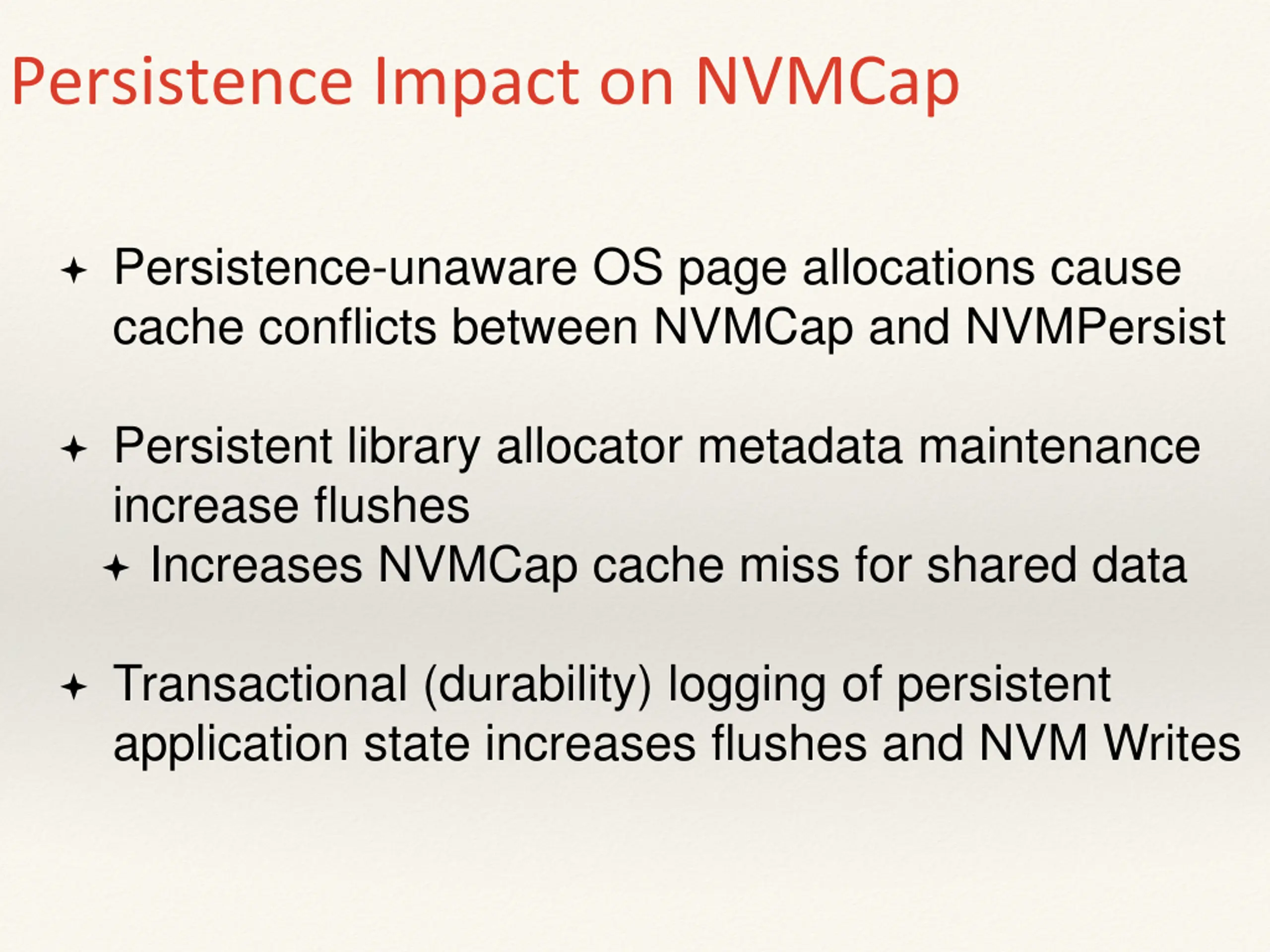Persistence Impact on NVMCap Persistence-unaware OS page allocations cause cache conflicts between NVMCap and NVMPersist Persistent library allocator metadata maintenance increase flushes Increases NVMCap cache miss for shared data Transactional (durability) logging of persistent application state increases flushes and NVM Writes
