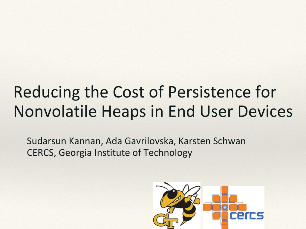 Reducing the Cost of Persistence for Nonvolatile Heaps in End User Devices Sudarsun Kannan, Ada Gavrilovska, Karsten Schwan CERCS, Georgia Institute of Technology