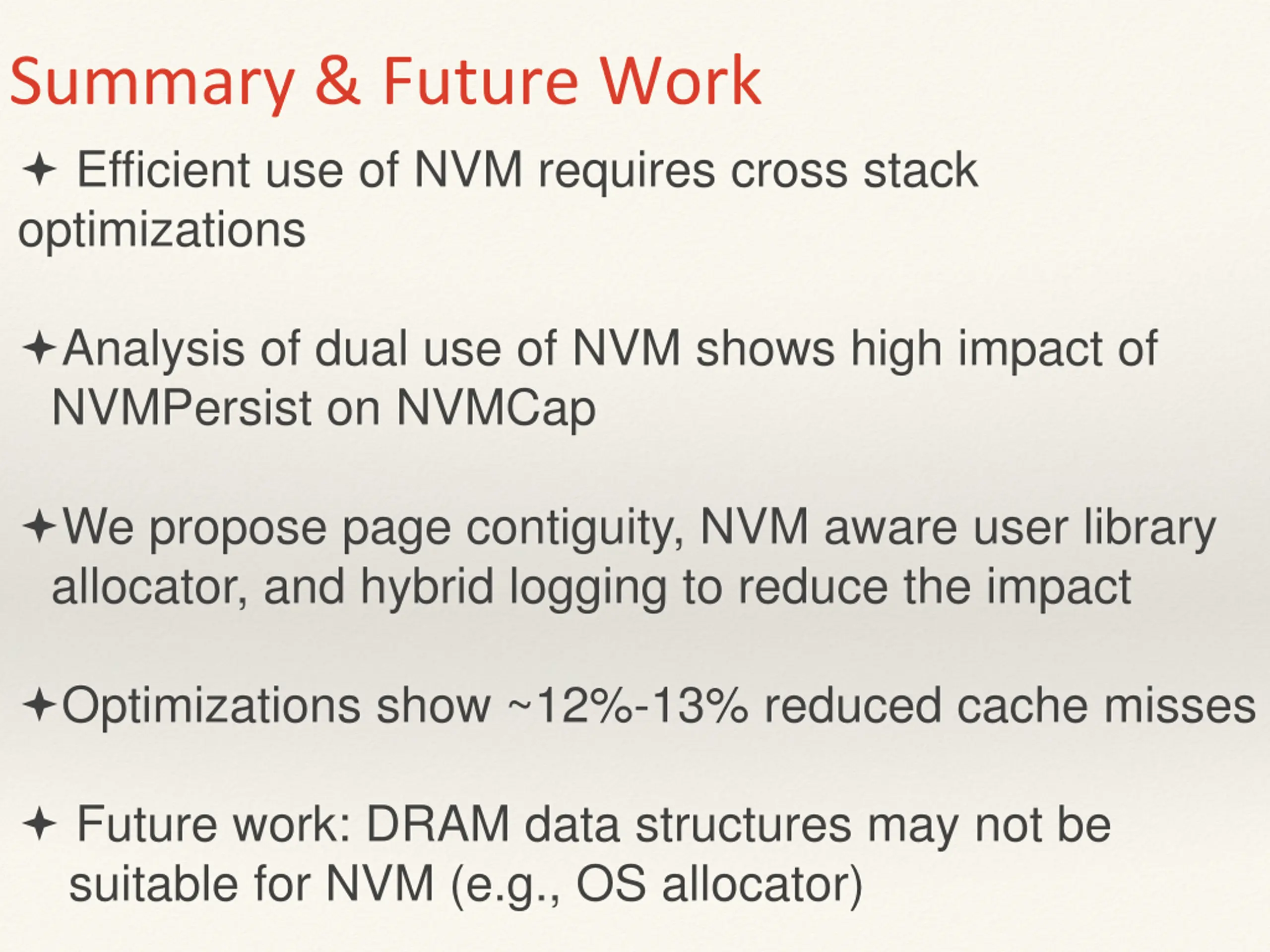 Summary & Future Work Efficient use of NVM requires cross stack optimizations Analysis of dual use of NVM shows high impact of NVMPersist on NVMCap We propose page contiguity, NVM aware user library allocator, and hybrid logging to reduce the impact Optimizations show ~12%-13% reduced cache misses Future work: DRAM data structures may not be suitable for NVM (e.g., OS allocator)
