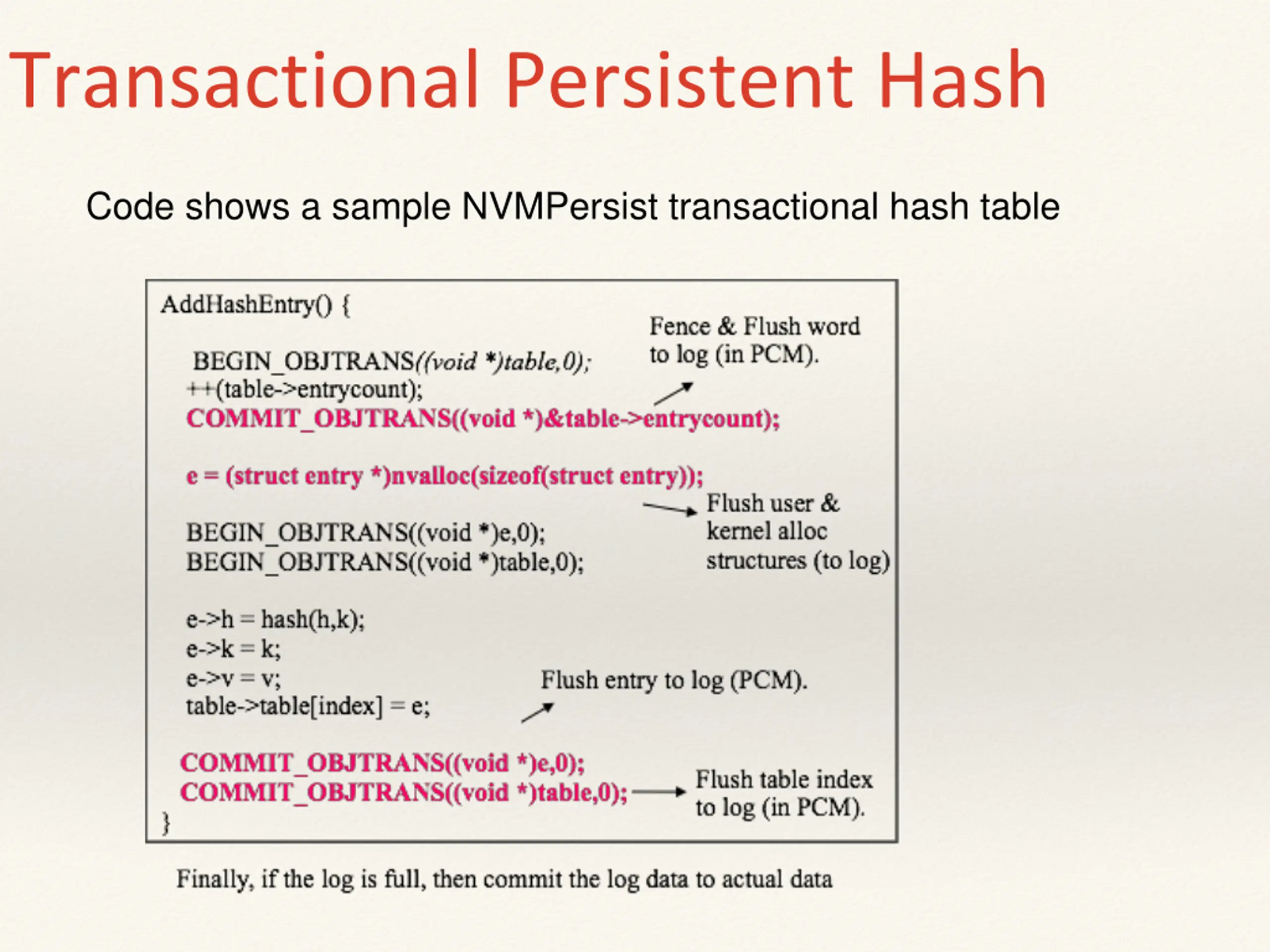 Transactional Persistent Hash Code shows a sample NVMPersist transactional hash table