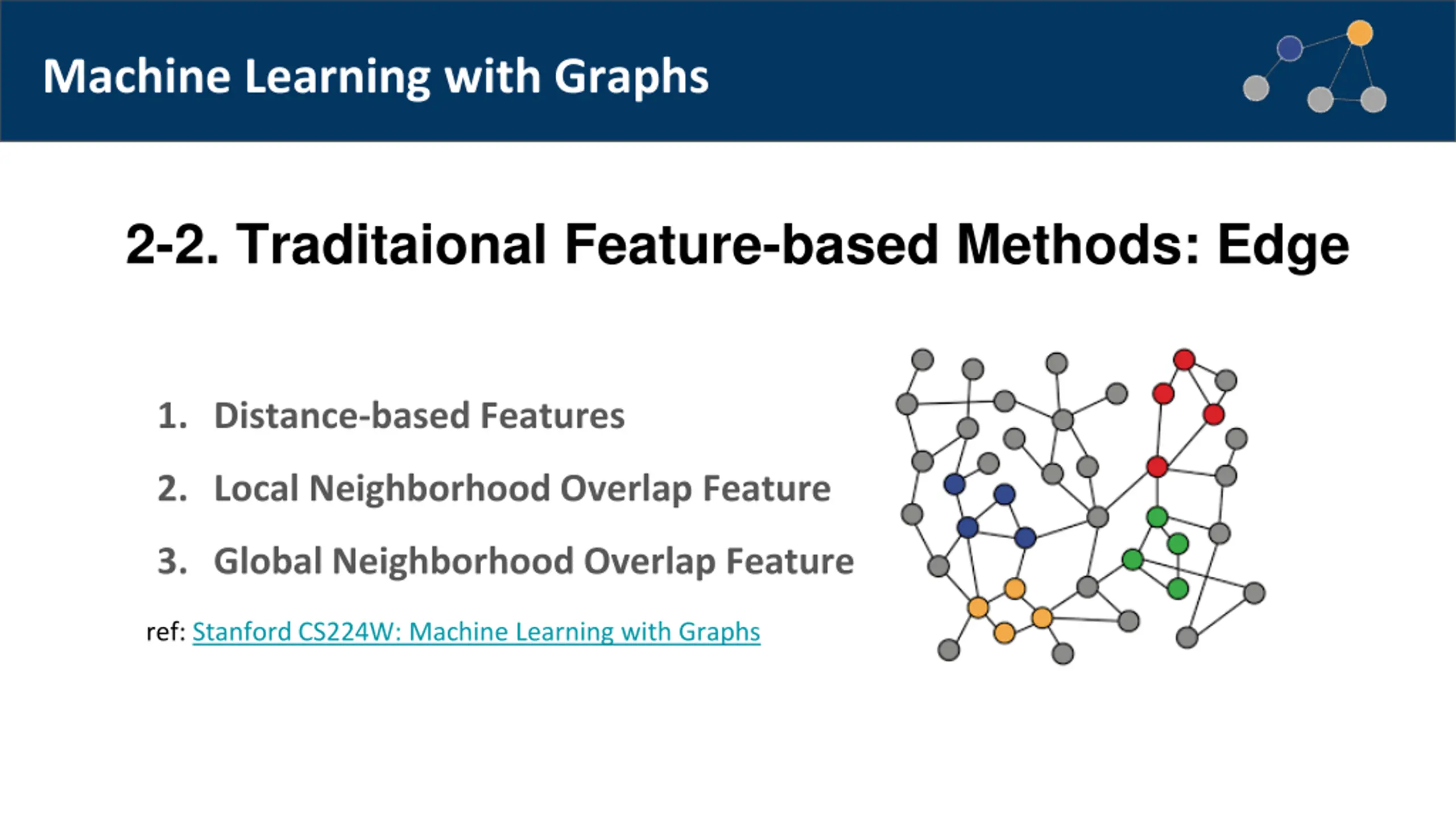 Machine Learning with Graphs 2-2. Traditaional Feature-based Methods: Edge 1. Distance-based Features 2. Local Neighborhood Overlap Feature 3. Global Neighborhood Overlap Feature ref: Stanford CS224W: Machine Learning with Graphs