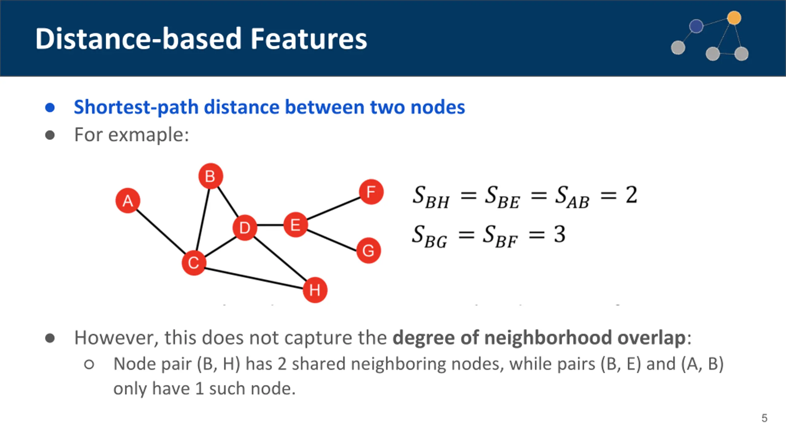 Edge-level Features: Overview Goal: Characterize the structure and connectivity of nodes and edges in the network: Distance-based features Local neighborhood overlap Global neighborhood overlap 4