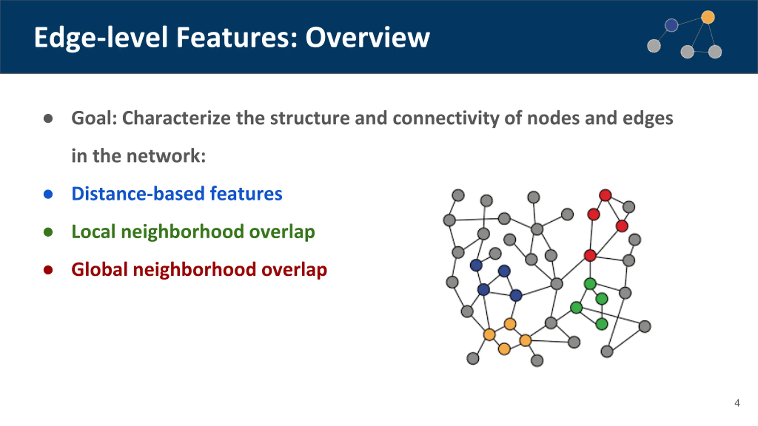 Explore traditional feature-based methods in machine learning with graphs, focusing on edge-level prediction tasks. Learn about distance-based features, local neighborhood overlap, global neighborhood overlap, and more to characterize the structure and connectivity of nodes and edges in networks.