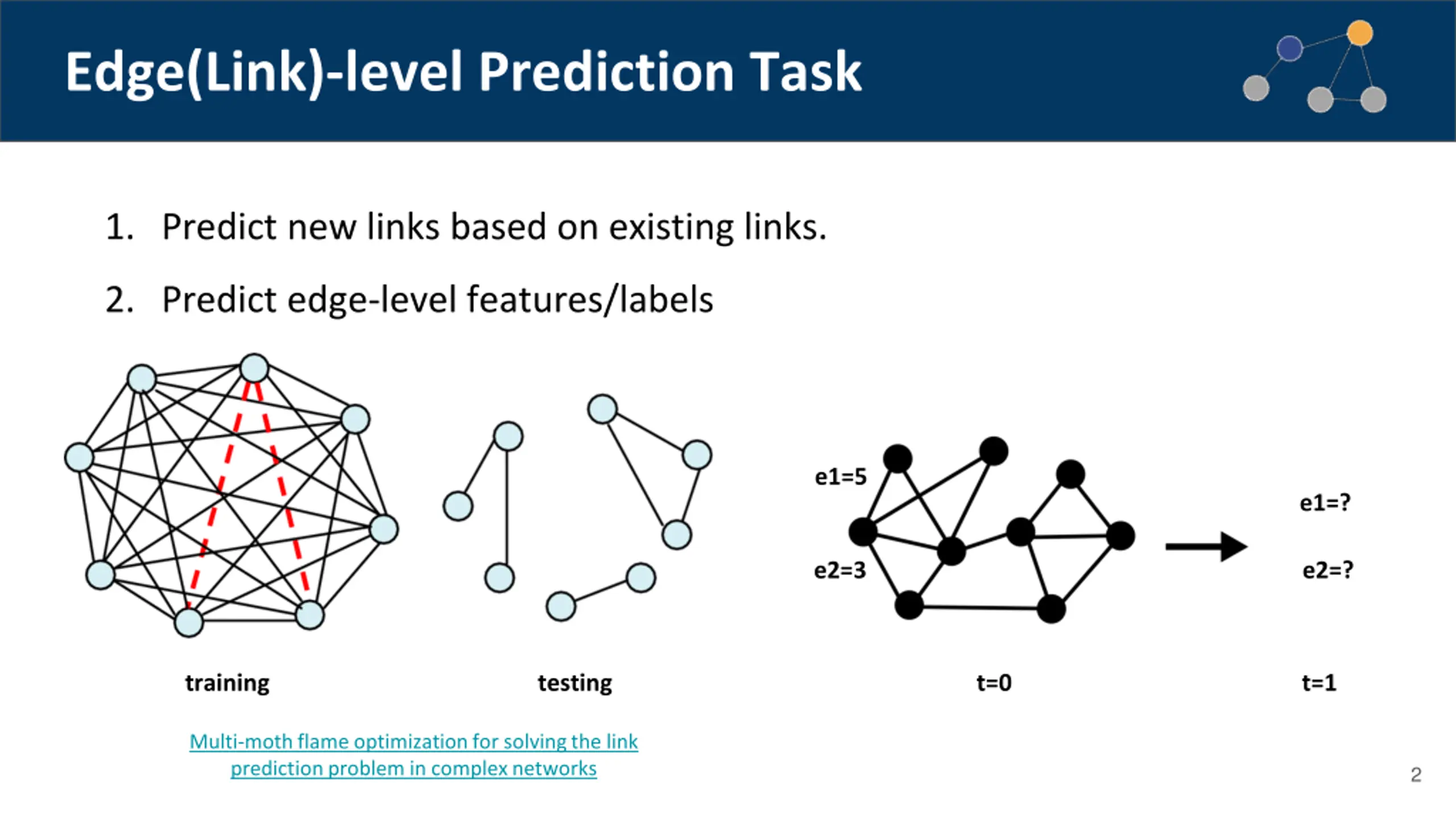 Edge(Link)-level Prediction Task 1. Predict new links based on existing links. 2. Predict edge-level features/labels e1=5 e1=? e2=3 e2=? training testing t=0 t=1 Multi-moth flame optimization for solving the link prediction problem in complex networks 2