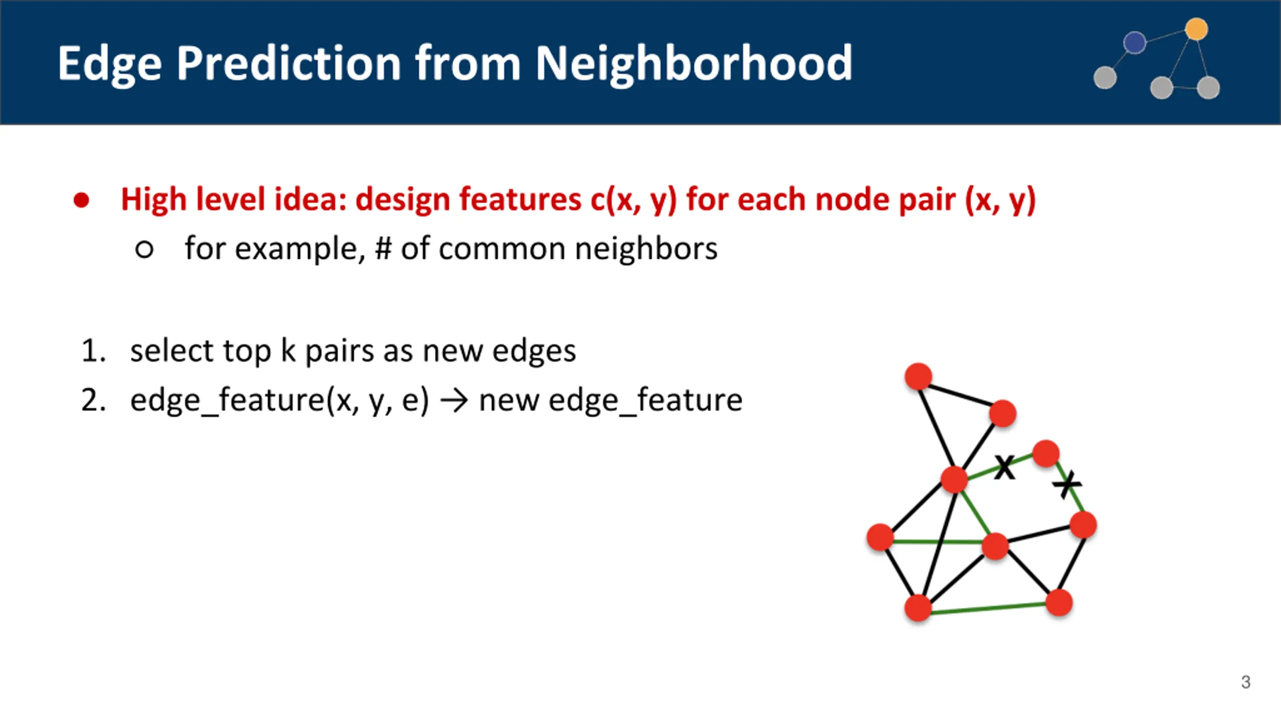 Edge Prediction from Neighborhood High level idea: design features c(x, y) for each node pair (x, y) for example, # of common neighbors 1. select top k pairs as new edges 2. edge_feature(x, y, e) new edge_feature 3