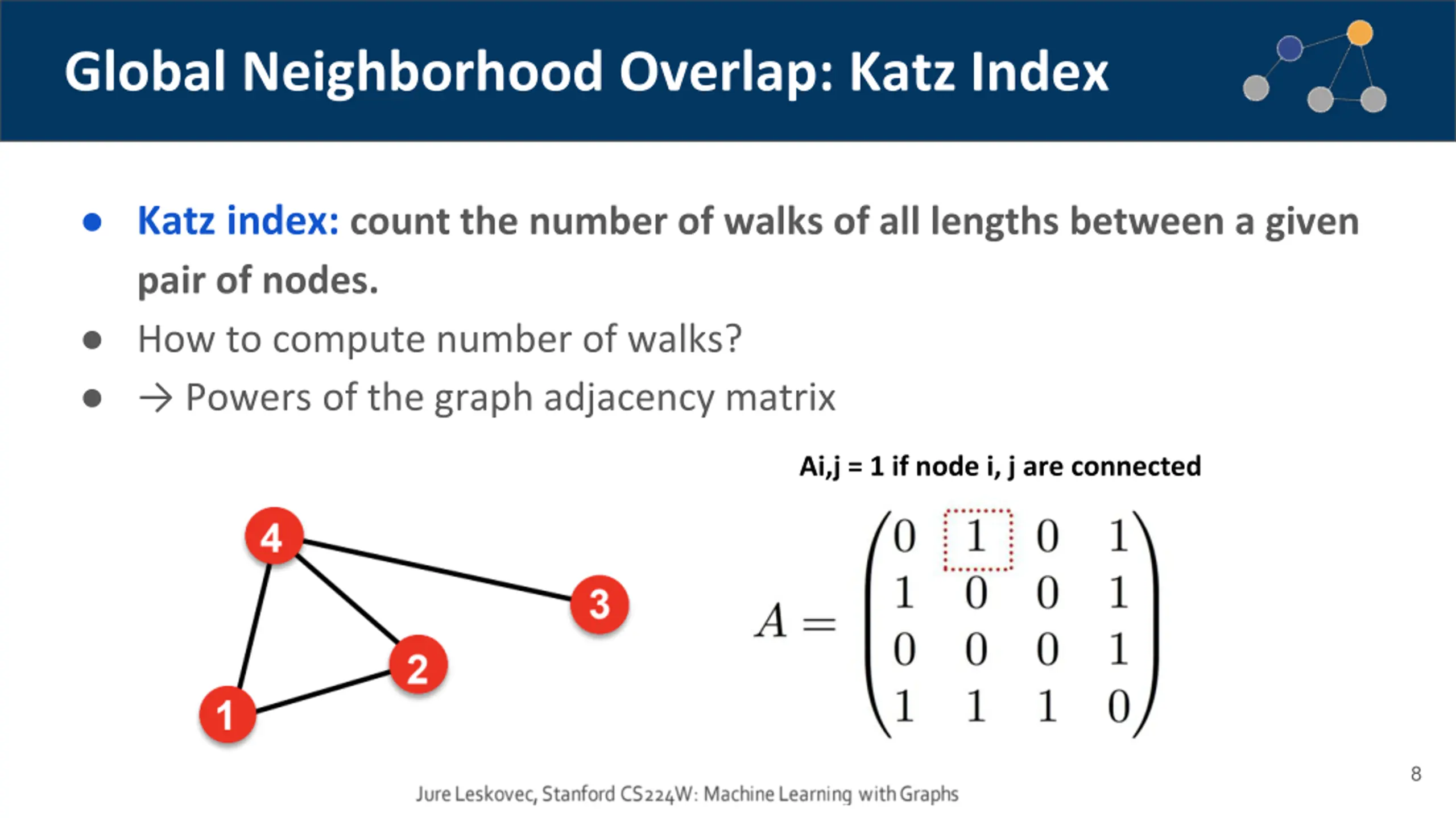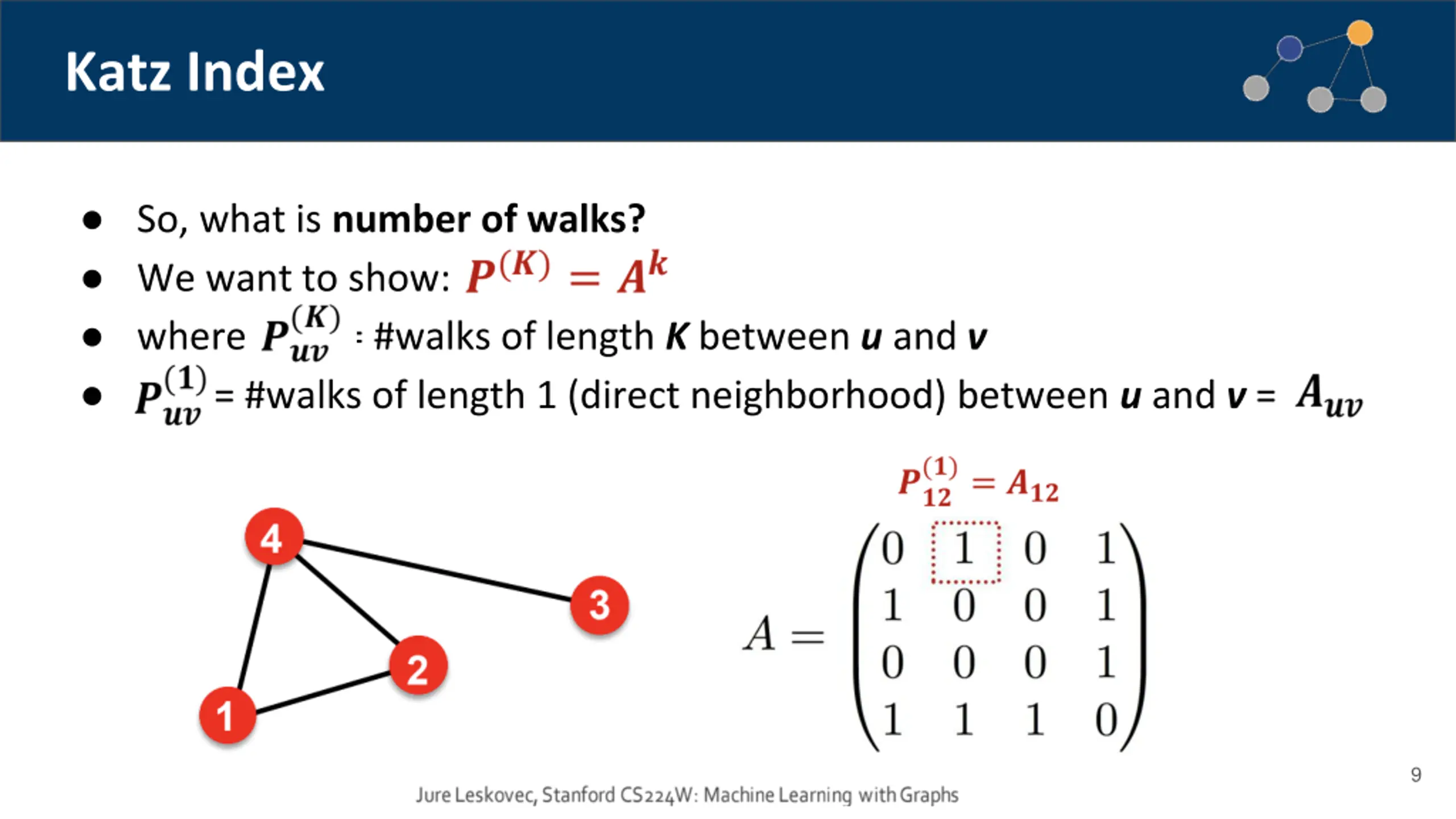 Global Neighborhood Overlap: Katz Index Katz index: count the number of walks of all lengths between a given pair of nodes. How to compute number of walks? Powers of the graph adjacency matrix Ai,j = 1 if node i, j are connected 8