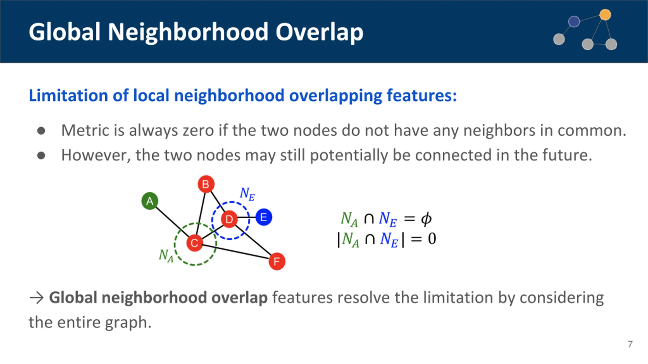 Local Neighborhood Overlap Captures # neighboring nodes shared between two nodes v1 and v2: Common neighbors: Jaccard s coefficient: Adamic-Adar index: 6
