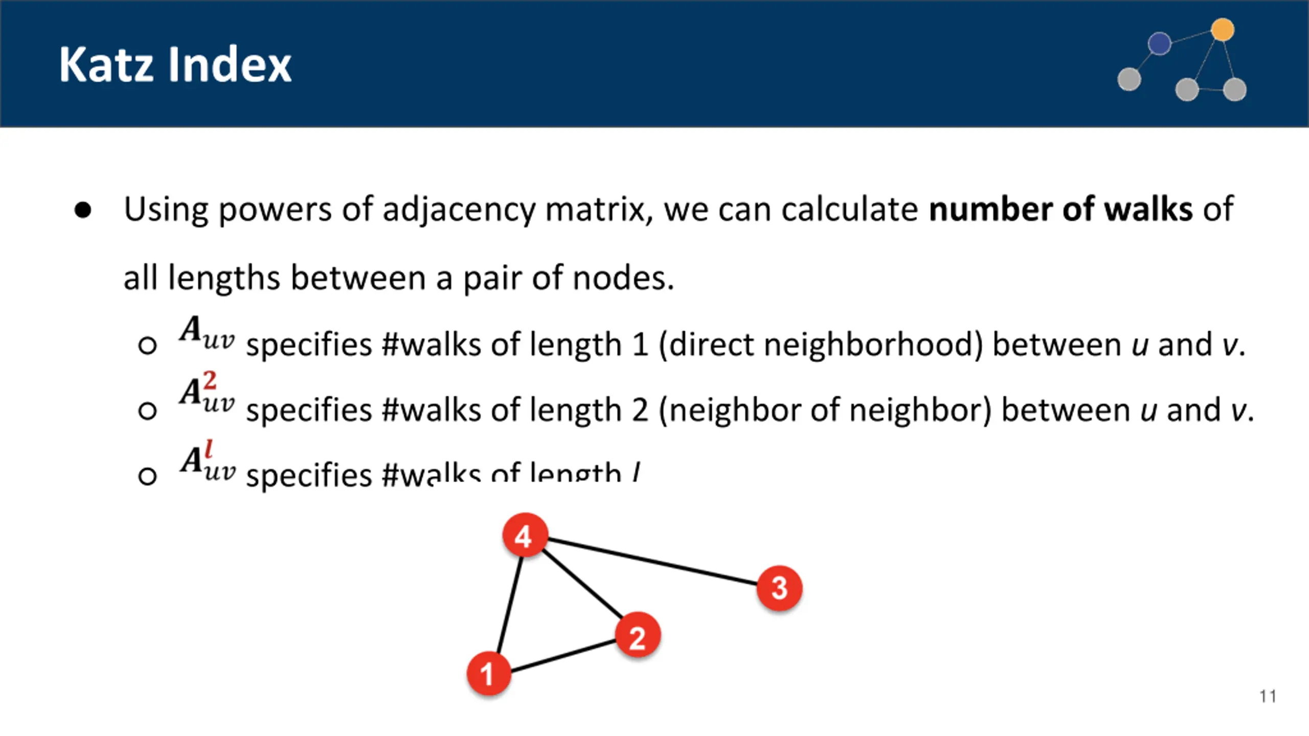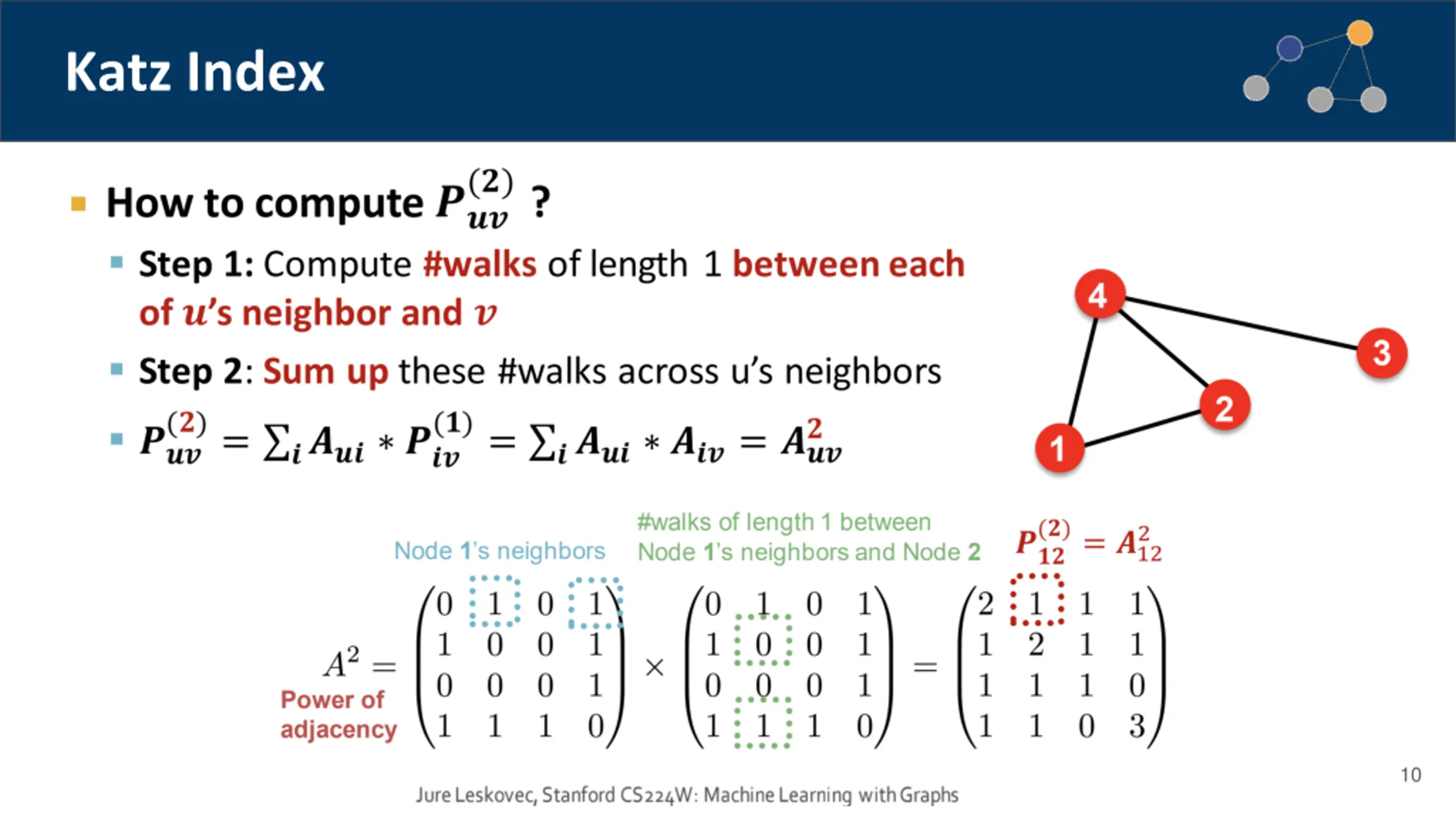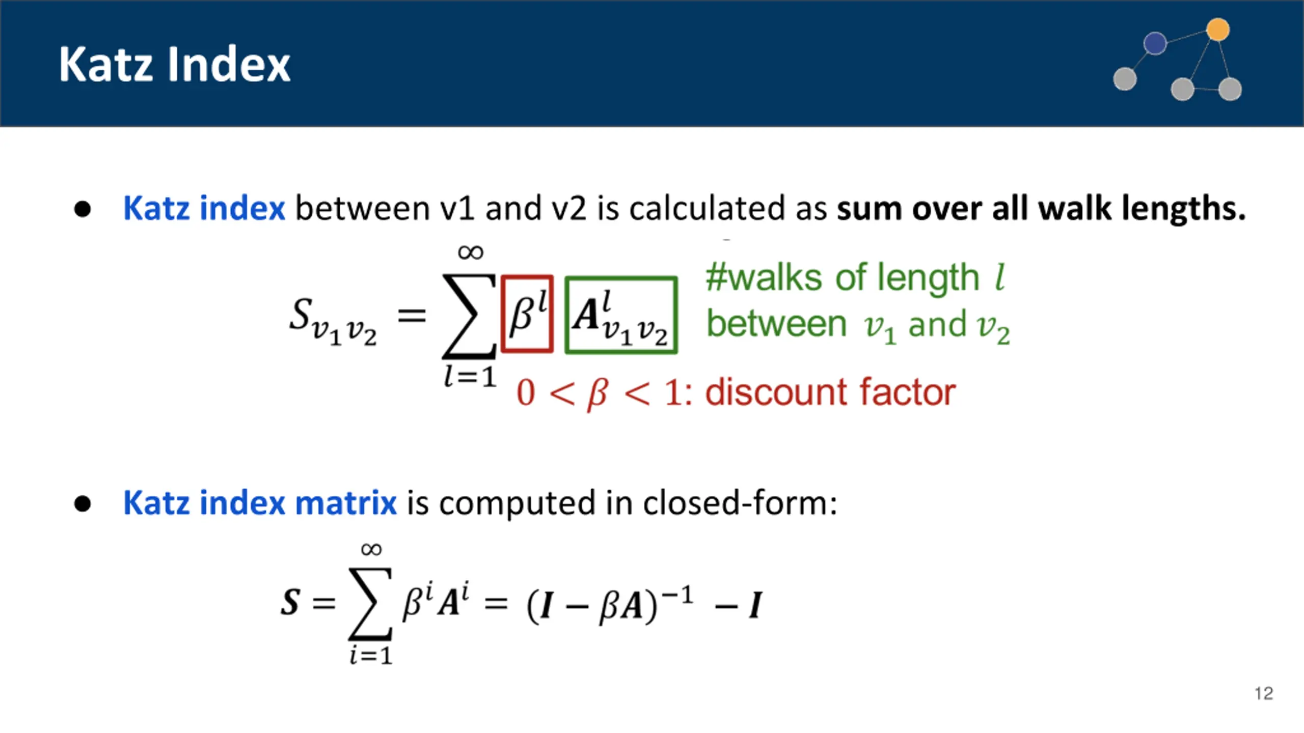 Katz Index Using powers of adjacency matrix, we can calculate number of walks of all lengths between a pair of nodes. specifies #walks of length 1 (direct neighborhood) between u and v. specifies #walks of length 2 (neighbor of neighbor) between u and v. specifies #walks of length l. 11