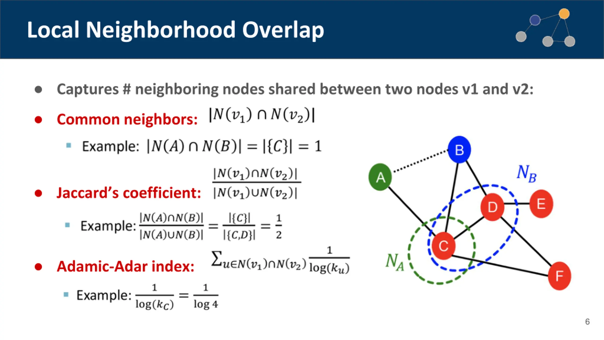 Distance-based Features Shortest-path distance between two nodes For exmaple: However, this does not capture the degree of neighborhood overlap: Node pair (B, H) has 2 shared neighboring nodes, while pairs (B, E) and (A, B) only have 1 such node. 5