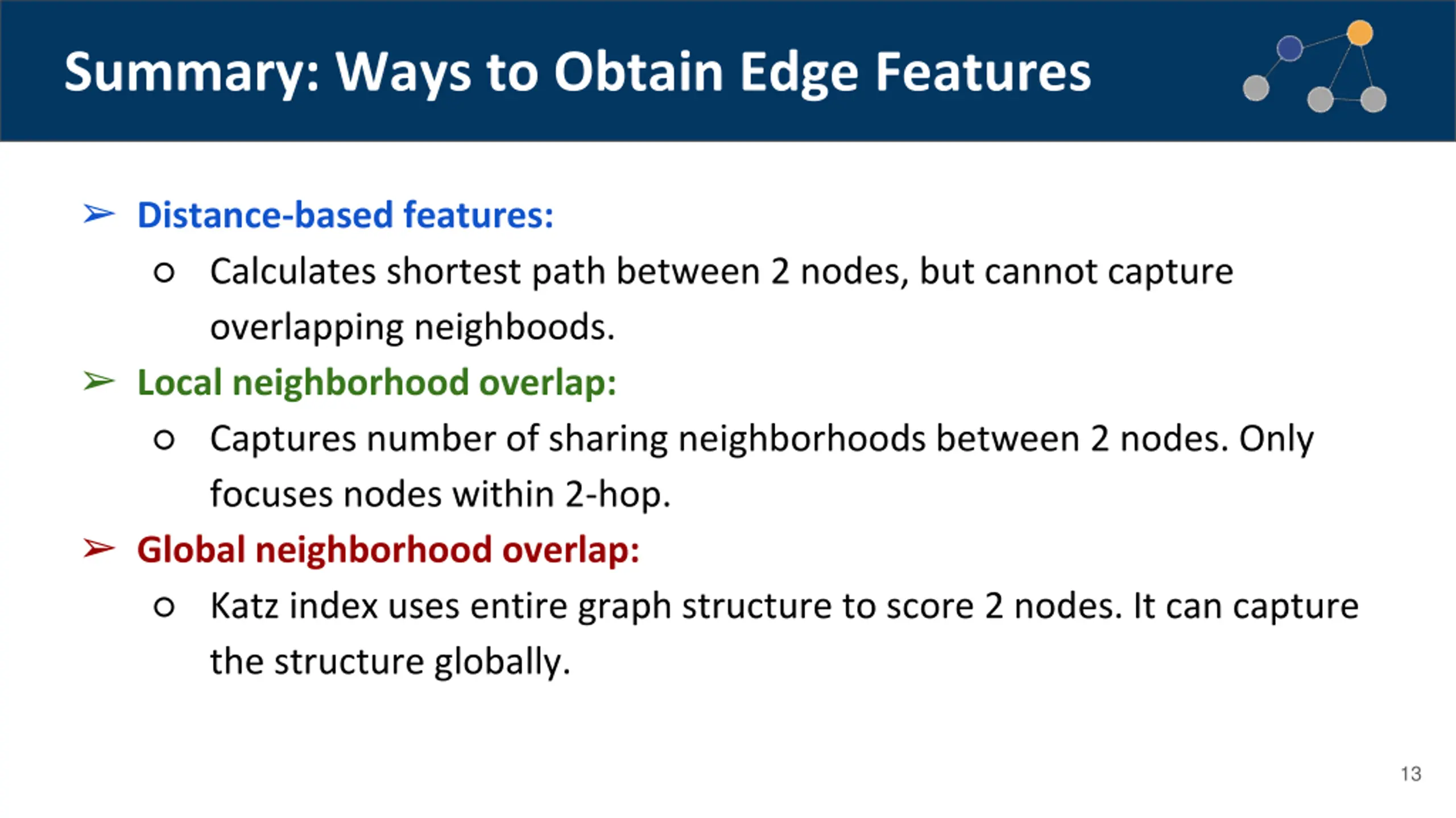 Summary: Ways to Obtain Edge Features Distance-based features: Calculates shortest path between 2 nodes, but cannot capture overlapping neighboods. Local neighborhood overlap: Captures number of sharing neighborhoods between 2 nodes. Only focuses nodes within 2-hop. Global neighborhood overlap: Katz index uses entire graph structure to score 2 nodes. It can capture the structure globally. 13