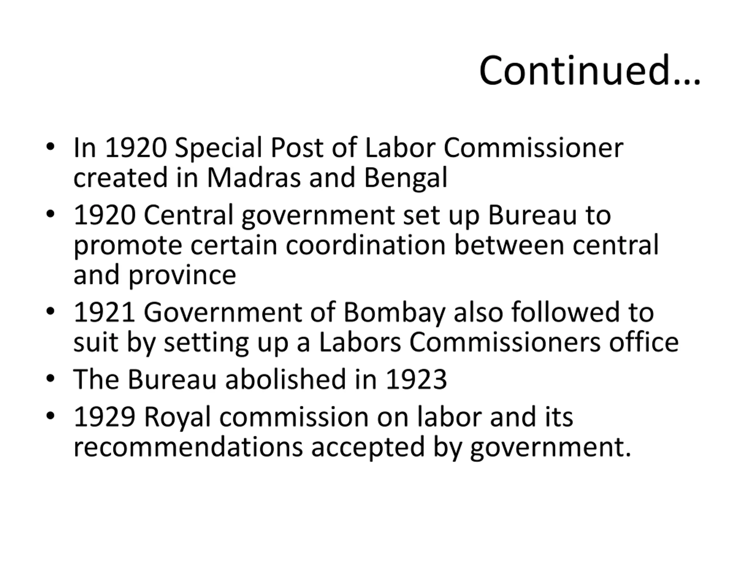 Continued In 1920 Special Post of Labor Commissioner created in Madras and Bengal 1920 Central government set up Bureau to promote certain coordination between central and province 1921 Government of Bombay also followed to suit by setting up a Labors Commissioners office The Bureau abolished in 1923 1929 Royal commission on labor and its recommendations accepted by government.