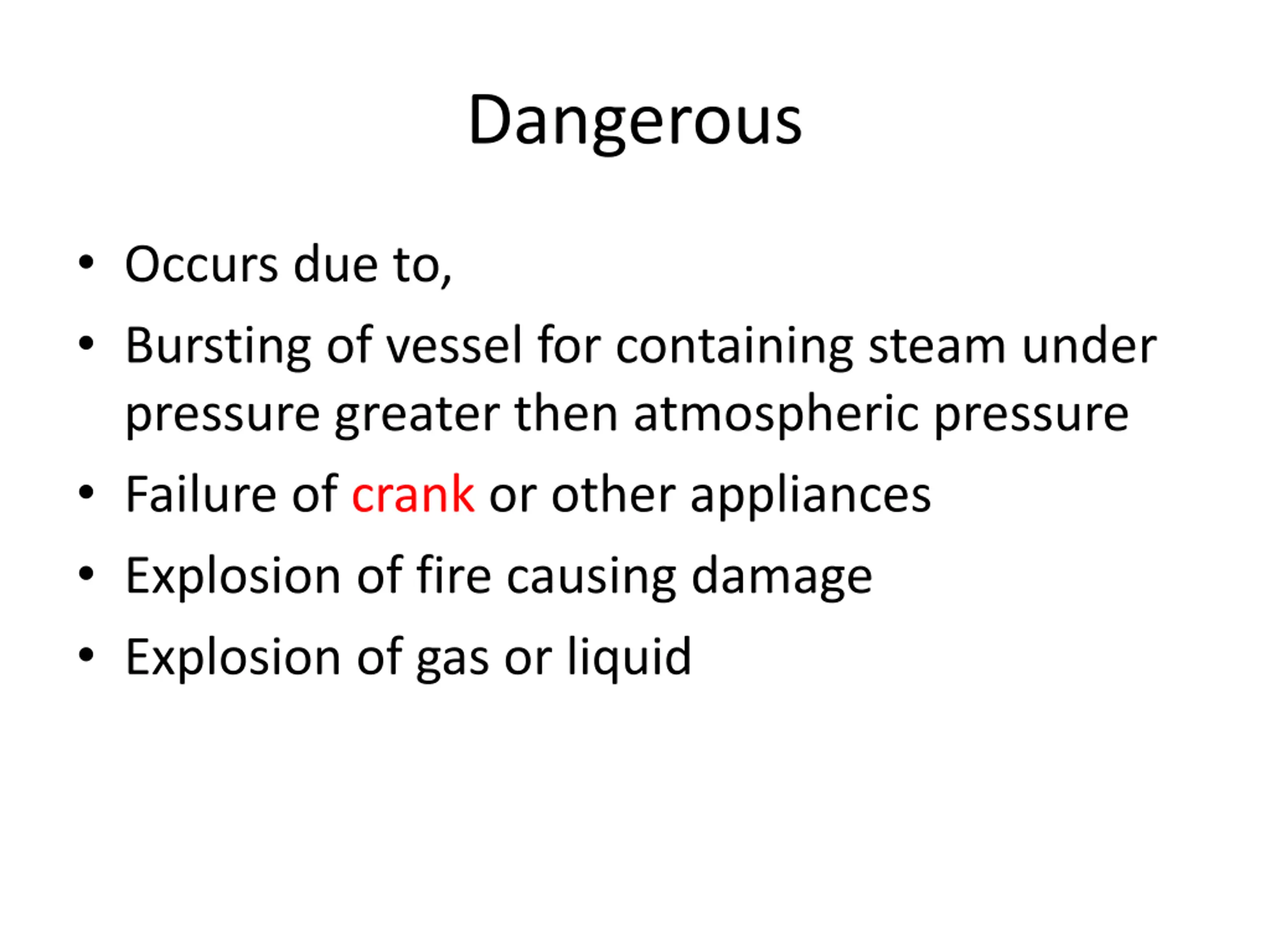 Dangerous Occurs due to, Bursting of vessel for containing steam under pressure greater then atmospheric pressure Failure of crank or other appliances Explosion of fire causing damage Explosion of gas or liquid