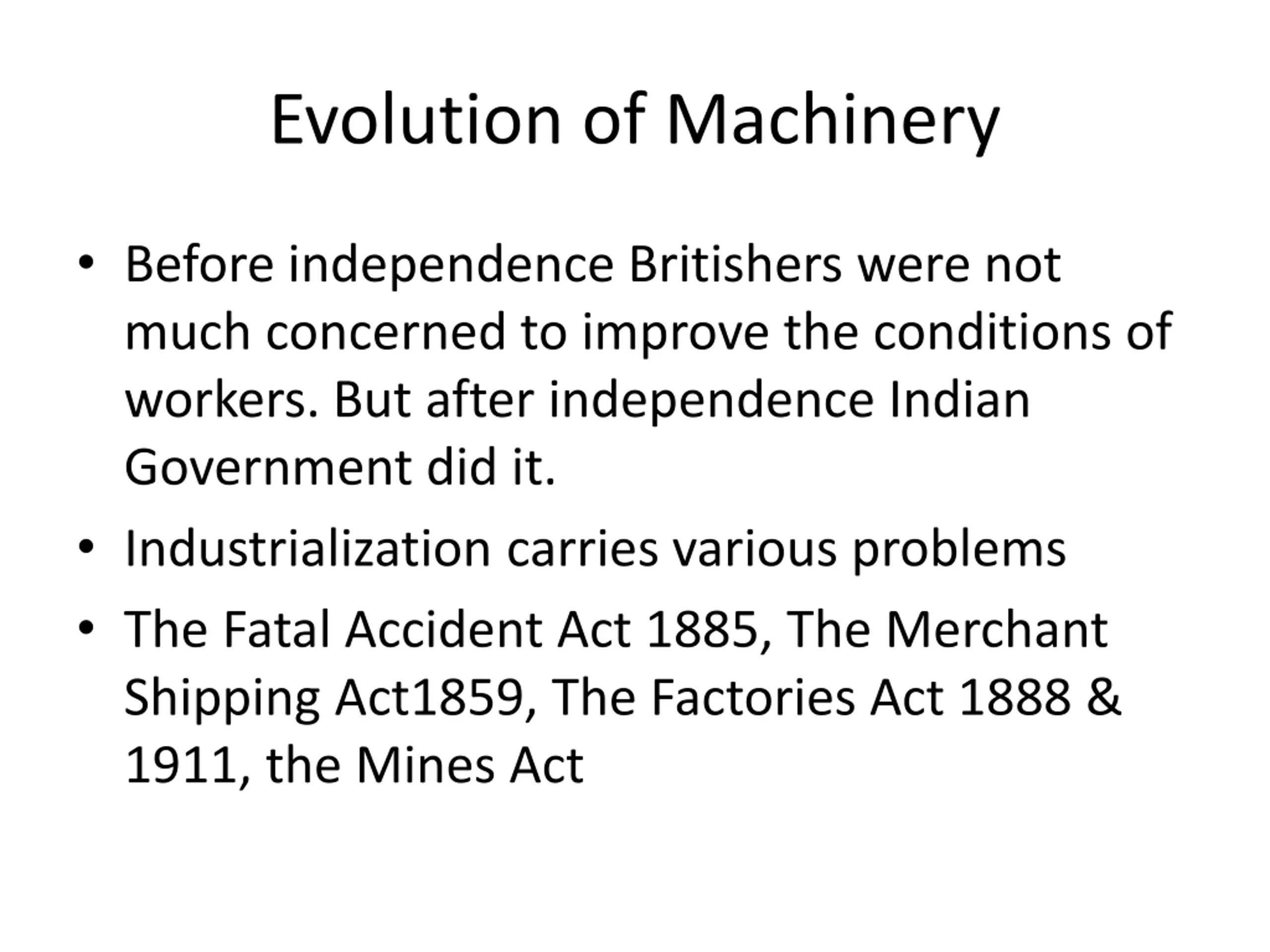 Evolution of Machinery Before independence Britishers were not much concerned to improve the conditions of workers. But after independence Indian Government did it. Industrialization carries various problems The Fatal Accident Act 1885, The Merchant Shipping Act1859, The Factories Act 1888 & 1911, the Mines Act