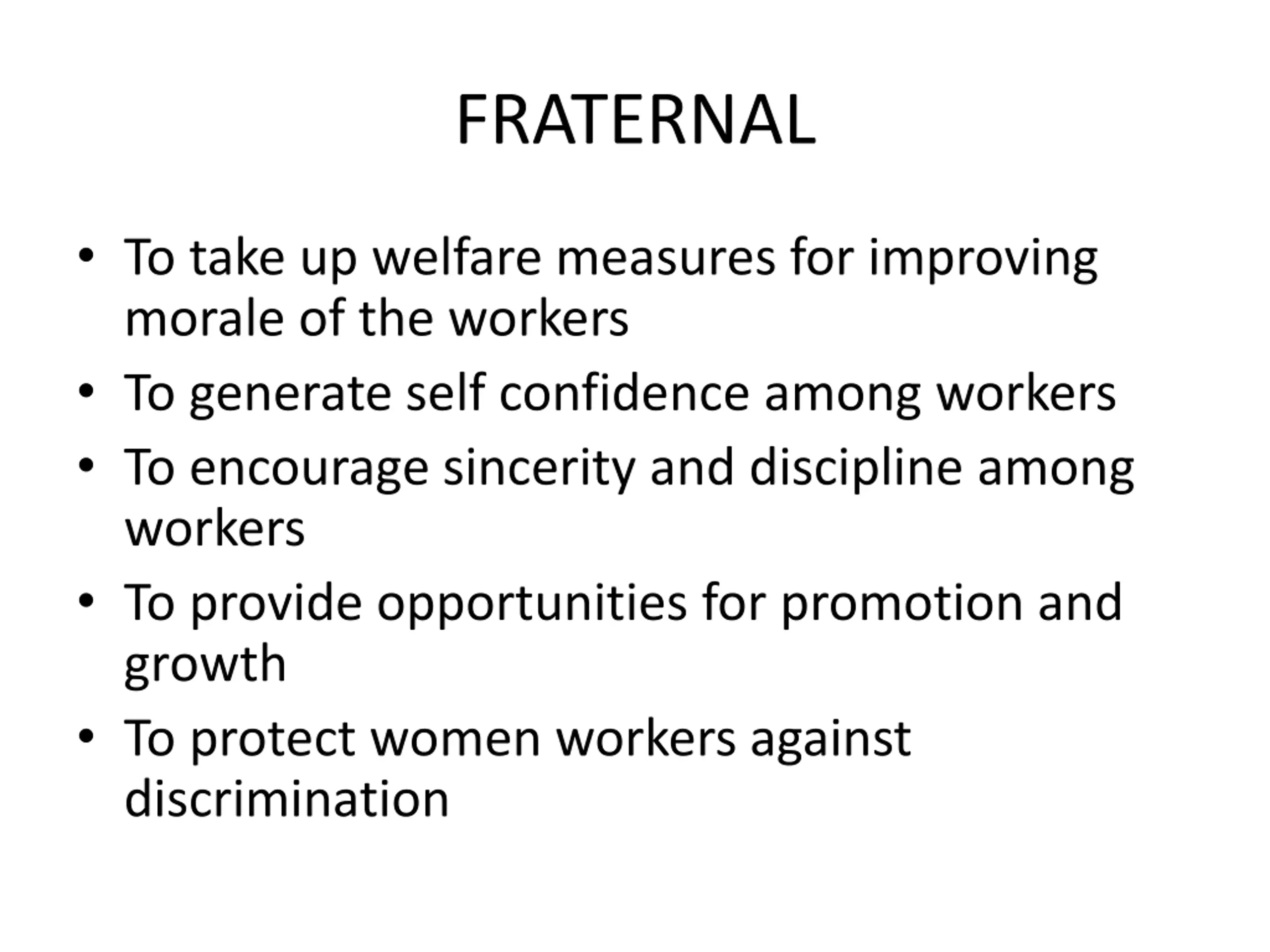 FRATERNAL To take up welfare measures for improving morale of the workers To generate self confidence among workers To encourage sincerity and discipline among workers To provide opportunities for promotion and growth To protect women workers against discrimination