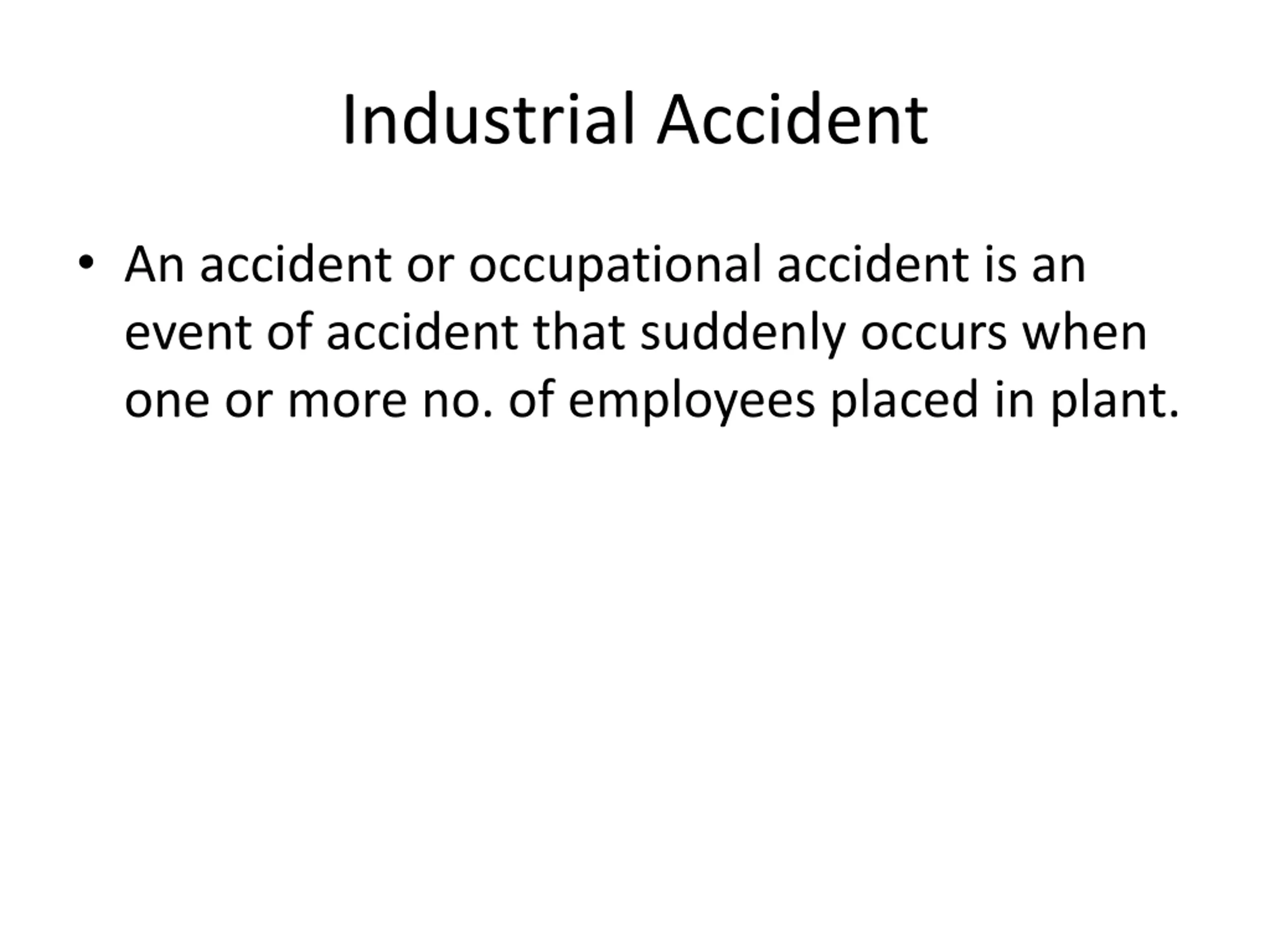 Industrial Accident An accident or occupational accident is an event of accident that suddenly occurs when one or more no. of employees placed in plant.