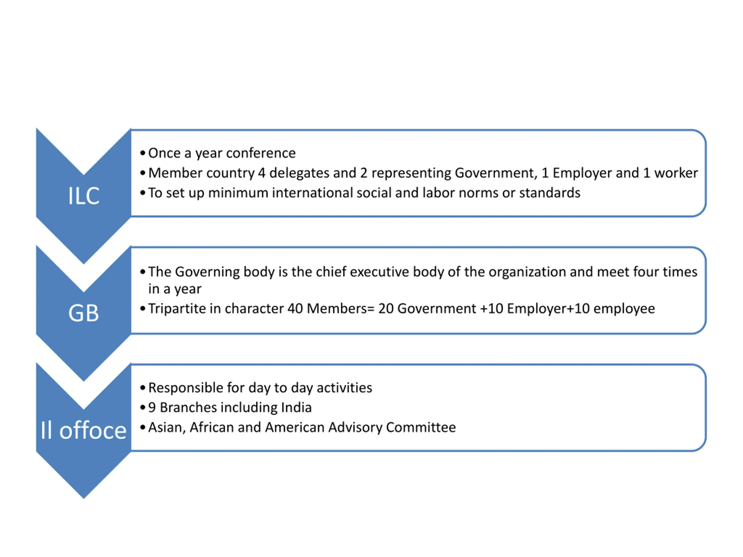 Once a year conference Member country 4 delegates and 2 representing Government, 1 Employer and 1 worker To set up minimum international social and labor norms or standards ILC The Governing body is the chief executive body of the organization and meet four times in a year Tripartite in character 40 Members= 20 Government +10 Employer+10 employee GB Responsible for day to day activities 9 Branches including India Asian, African and American Advisory Committee Il offoce